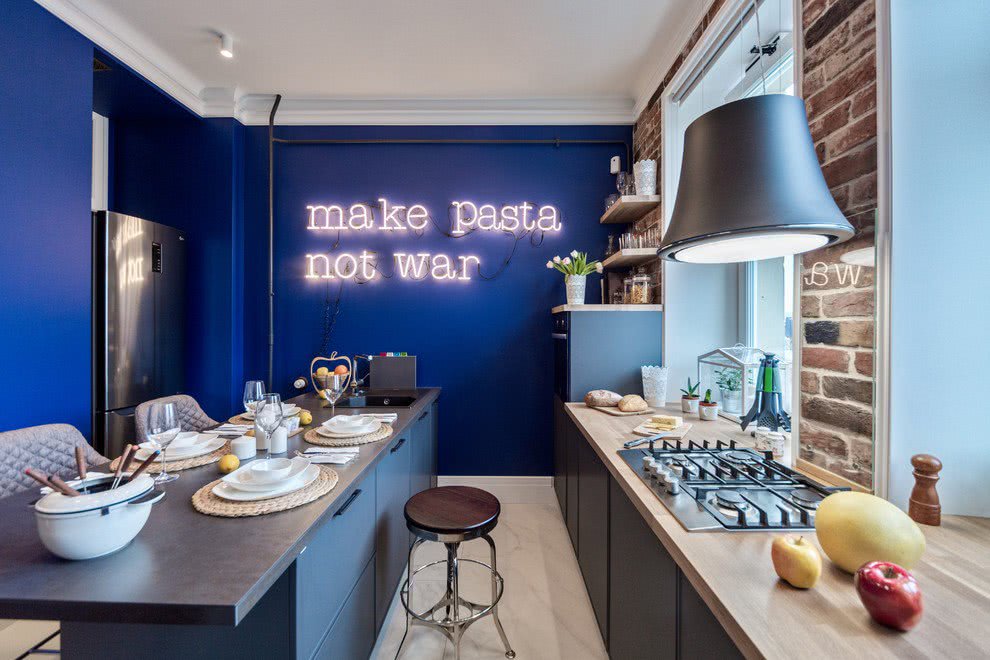Синяя кухня в смешанном стиле: лофт, классика, современность.