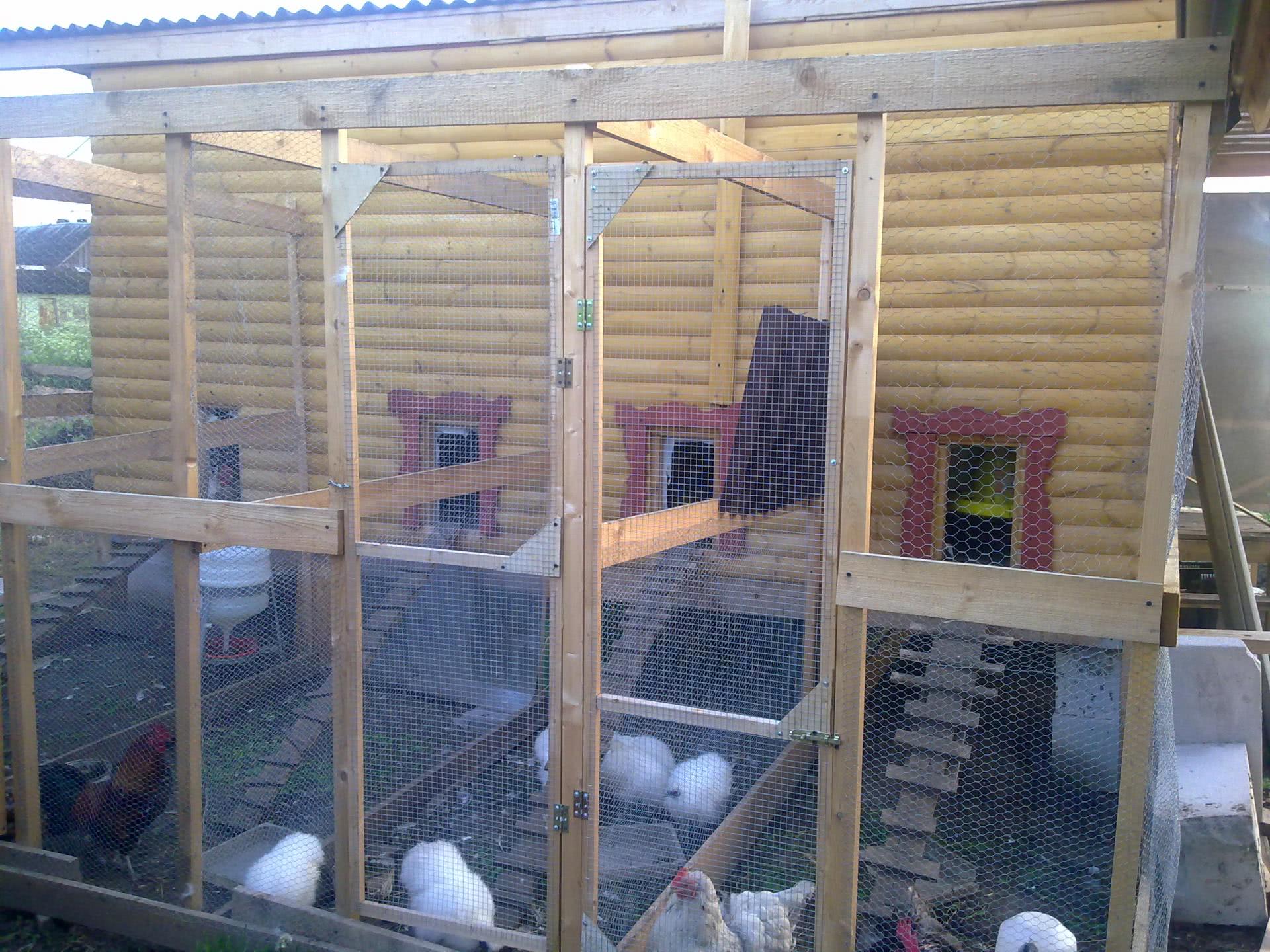 Обратите внимание! Для выгула птицы делают загон, таких же размеров, как и сам курятник. Он должен находиться под крышей и быть огорожен металлической сеткой