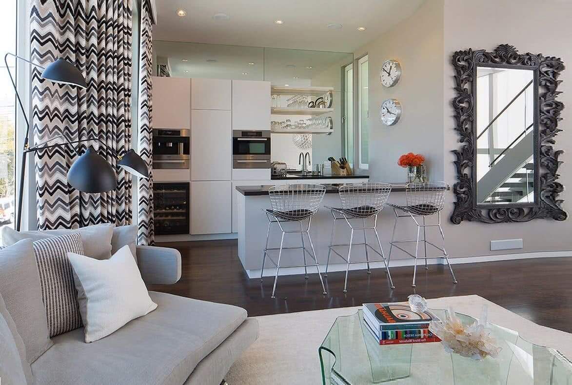 - В некоторых случаях может вообще не быть отдельно выделенного кухонного пространства, его заменяет наличие барной стойки и микроволновки;