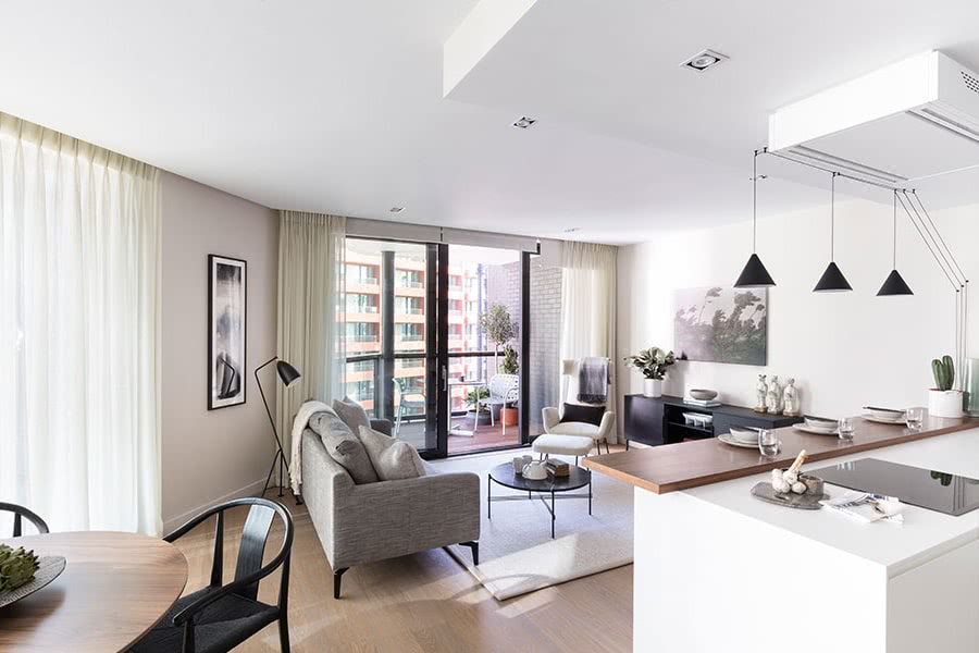 Подобный минималистичный дизайн, станет идеальным решением для малогабаритной квартиры. Расцветка данного интерьера, включает в себя серые, молочные, бежевые и светло-коричневые колеры. Поверхность пола чаще всего отделывают кафелем, линолеумом или светлым деревом. Мебельные элементы в основном встроенные, а различный текстиль и диванная обивка, отличаются однотонным исполнением.
