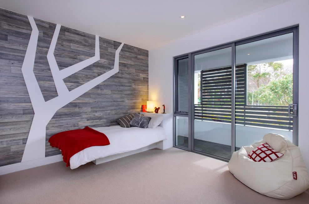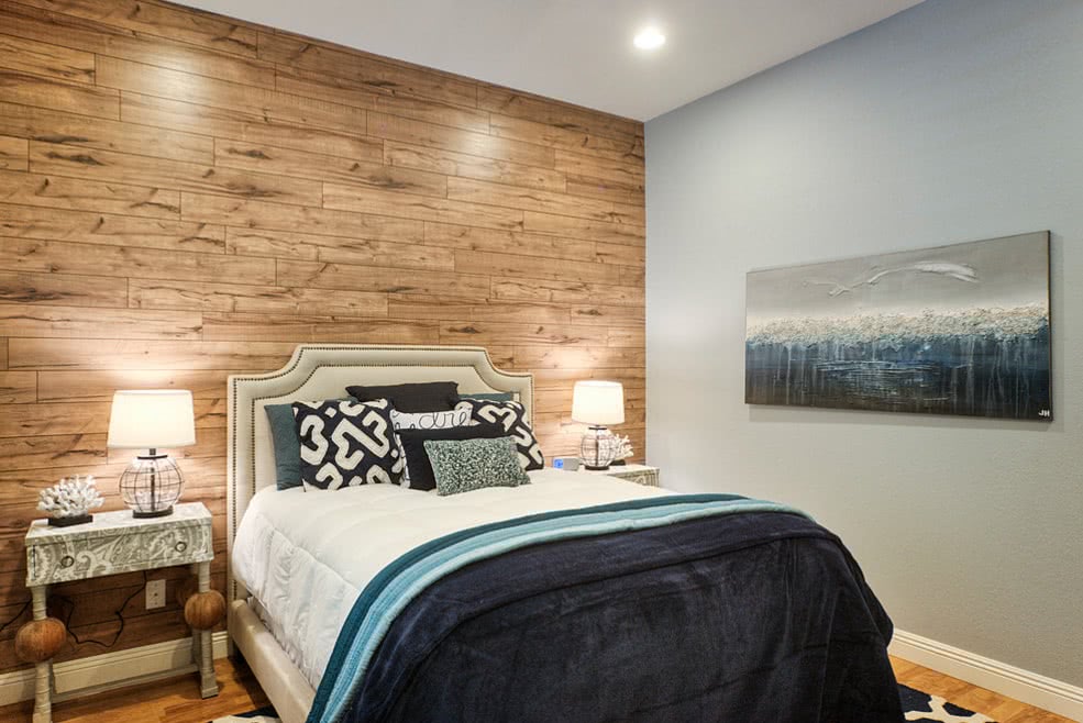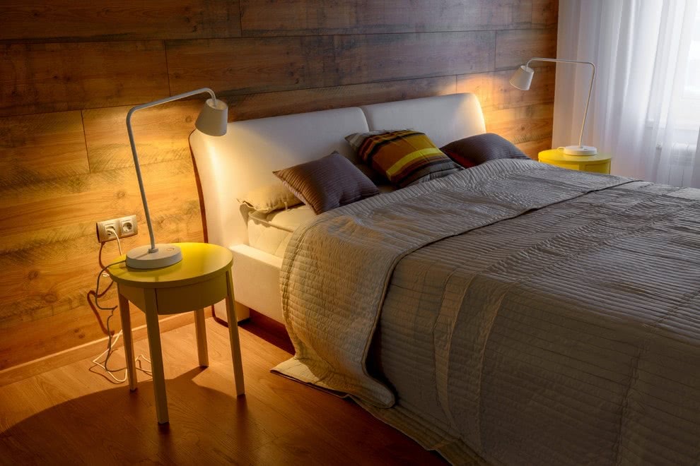 Если у тебя в спальне мало деревянной мебели, можешь смело обшивать ламинатом большие площади. Тогда фактура не будет повторяться слишком часто и не выглядит перегружено. А если же ты хочешь просто немного освежить интерьер или украсит маленькую спальню – деревянное панно из досок ламината смотрится свежо и оригинально.