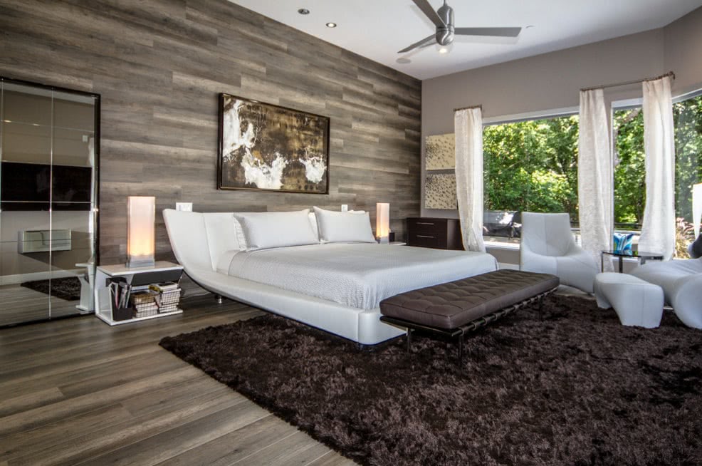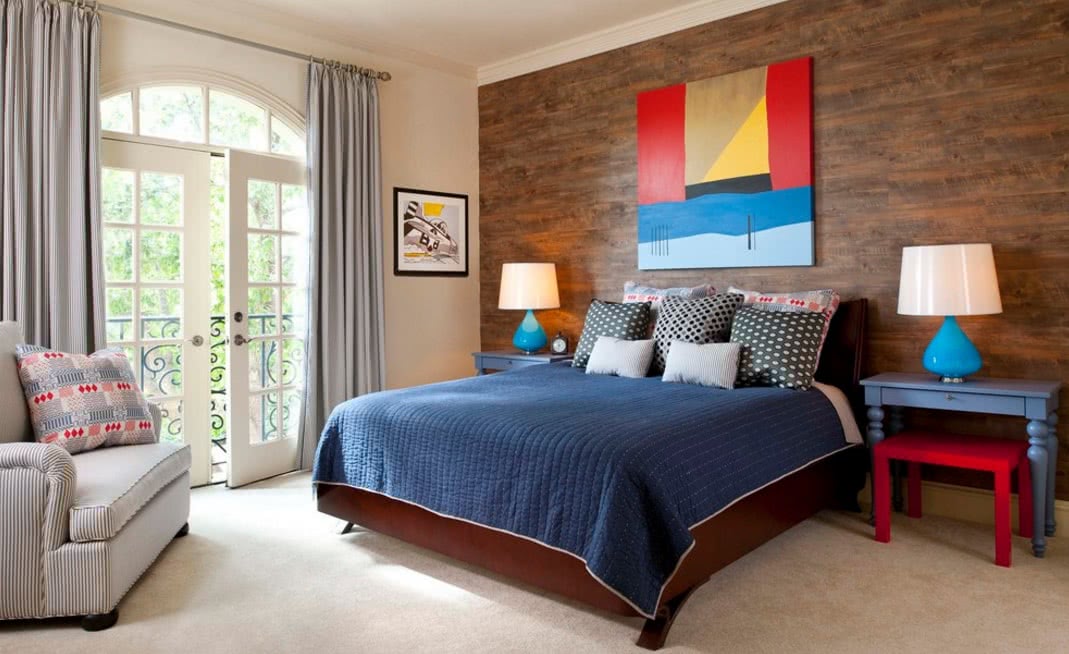 Интересно смотрится плавный переход одного и того же покрытия с пола на стену. Таким образом можно выделить зону кровати, особенно в интерьерах, которые тяготеют к выраженным центрам и симметричной композиции. С двух сторон установи прикроватные тумбочки с ночниками или настенными светильниками.
