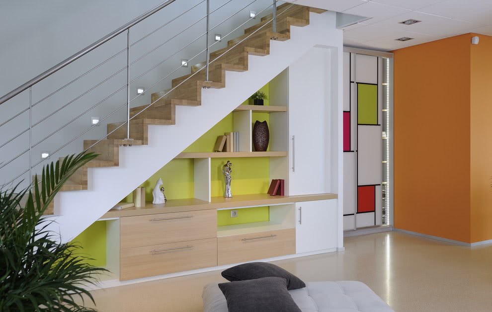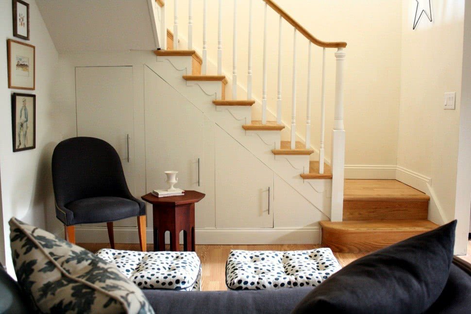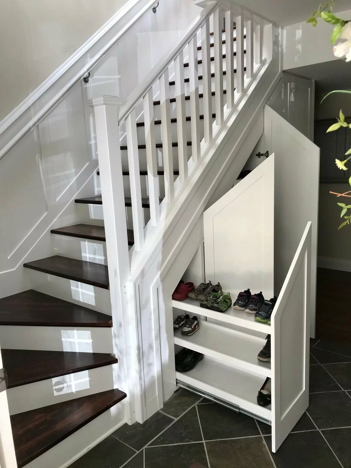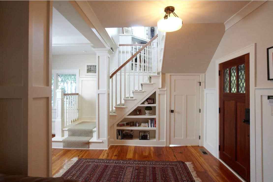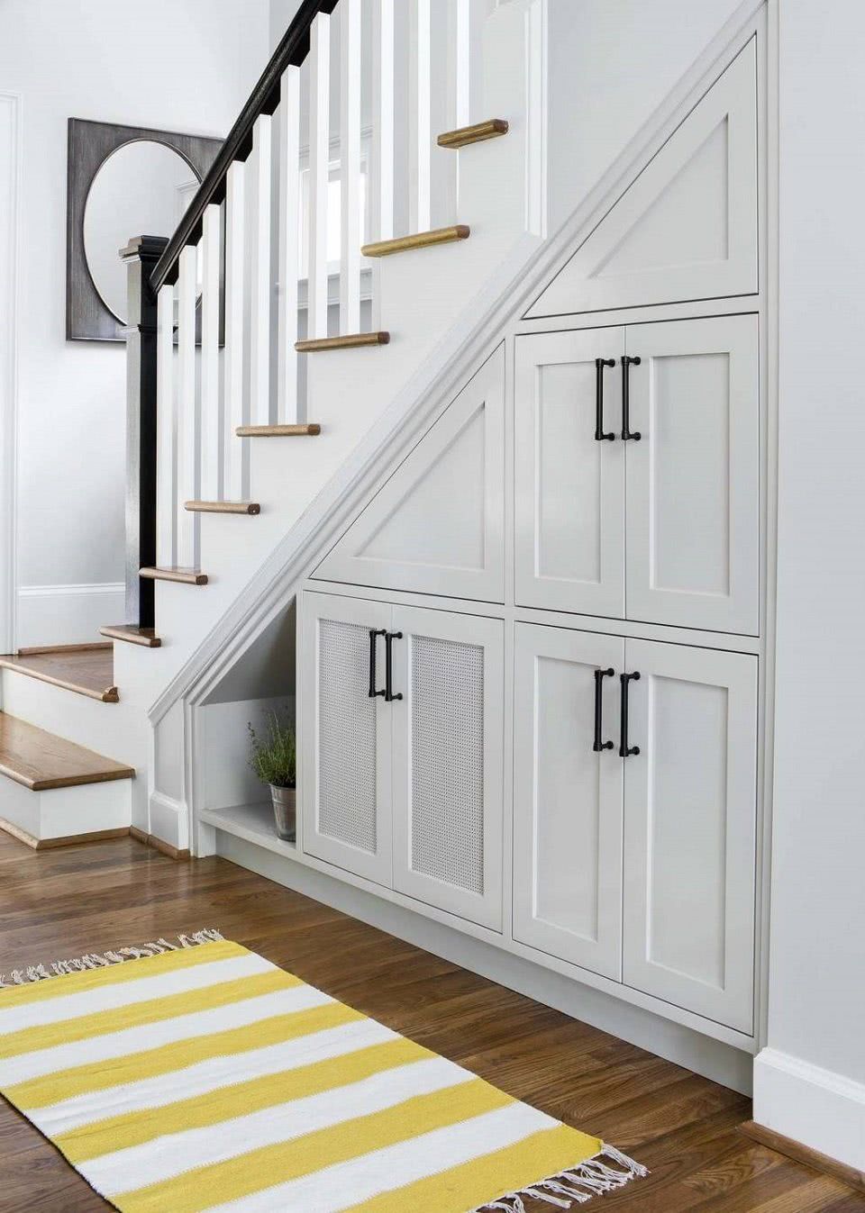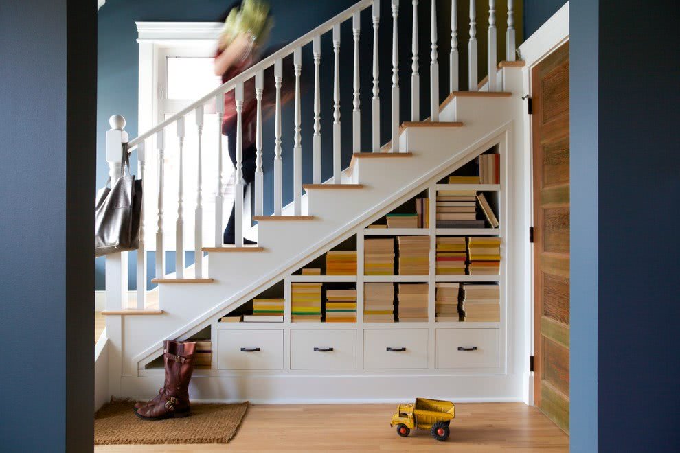 Все пространство вокруг лестницы можно эффективно застроить и обставить. Самый простой вариант — создать много открытых полок, шкафчиков и ящиков, а также удобное элегантное сиденье. Такое расположение, безусловно, найдет практическое применение в зале, где вы можете хранить шляпы, шарфы и другие аксессуары в небольших шкафах, а красивое сиденье обеспечит удобное место для надевания и снятия обуви.
