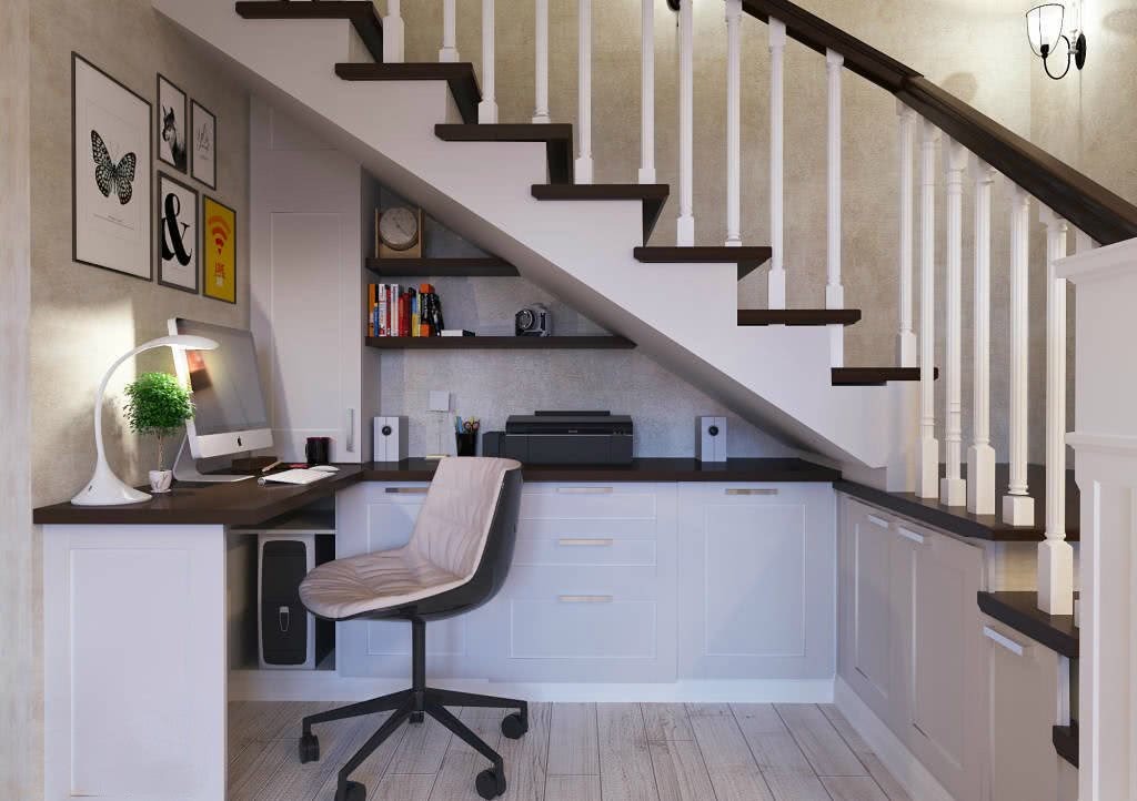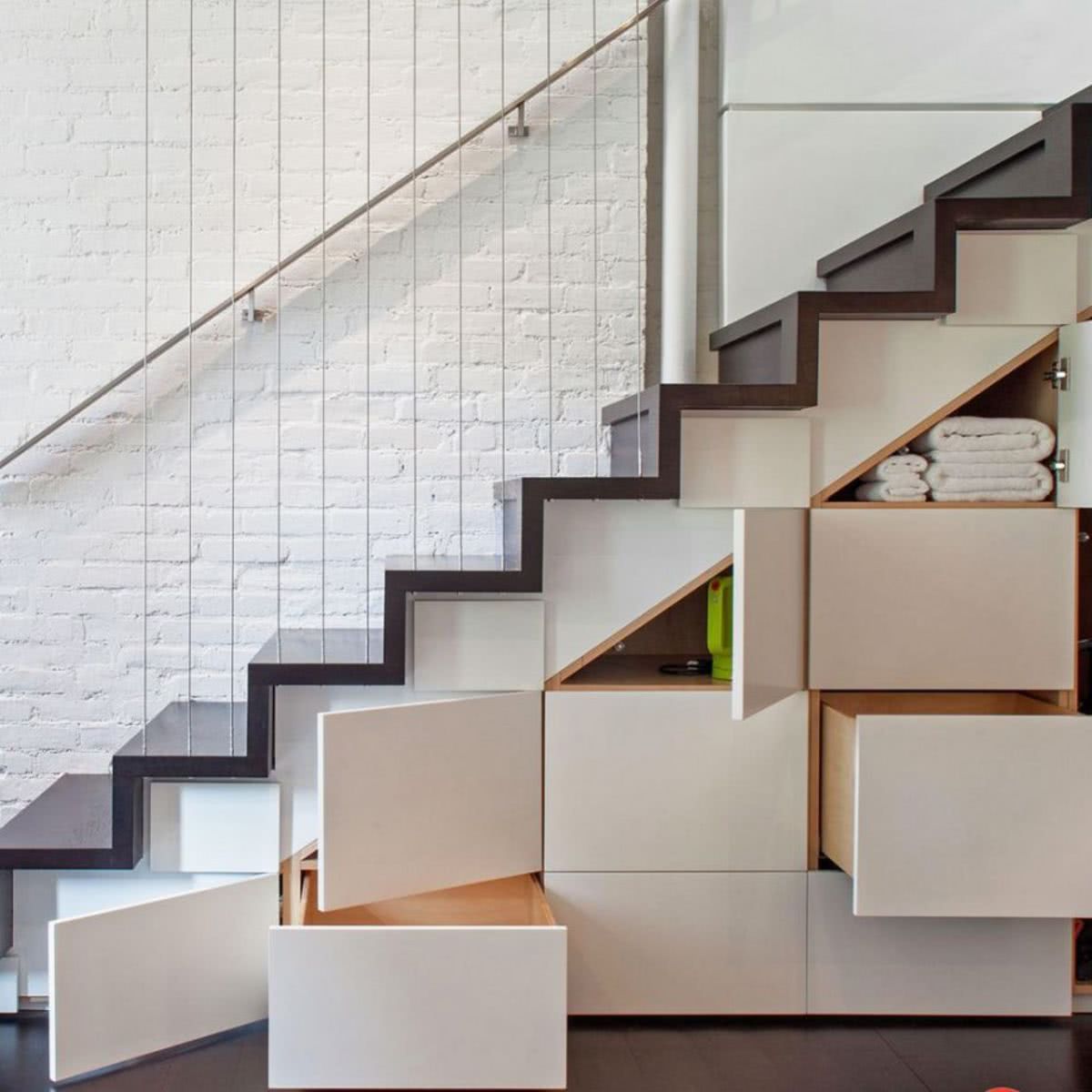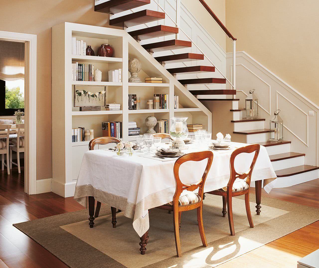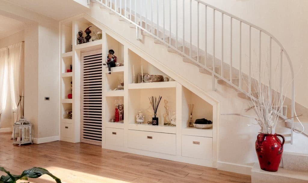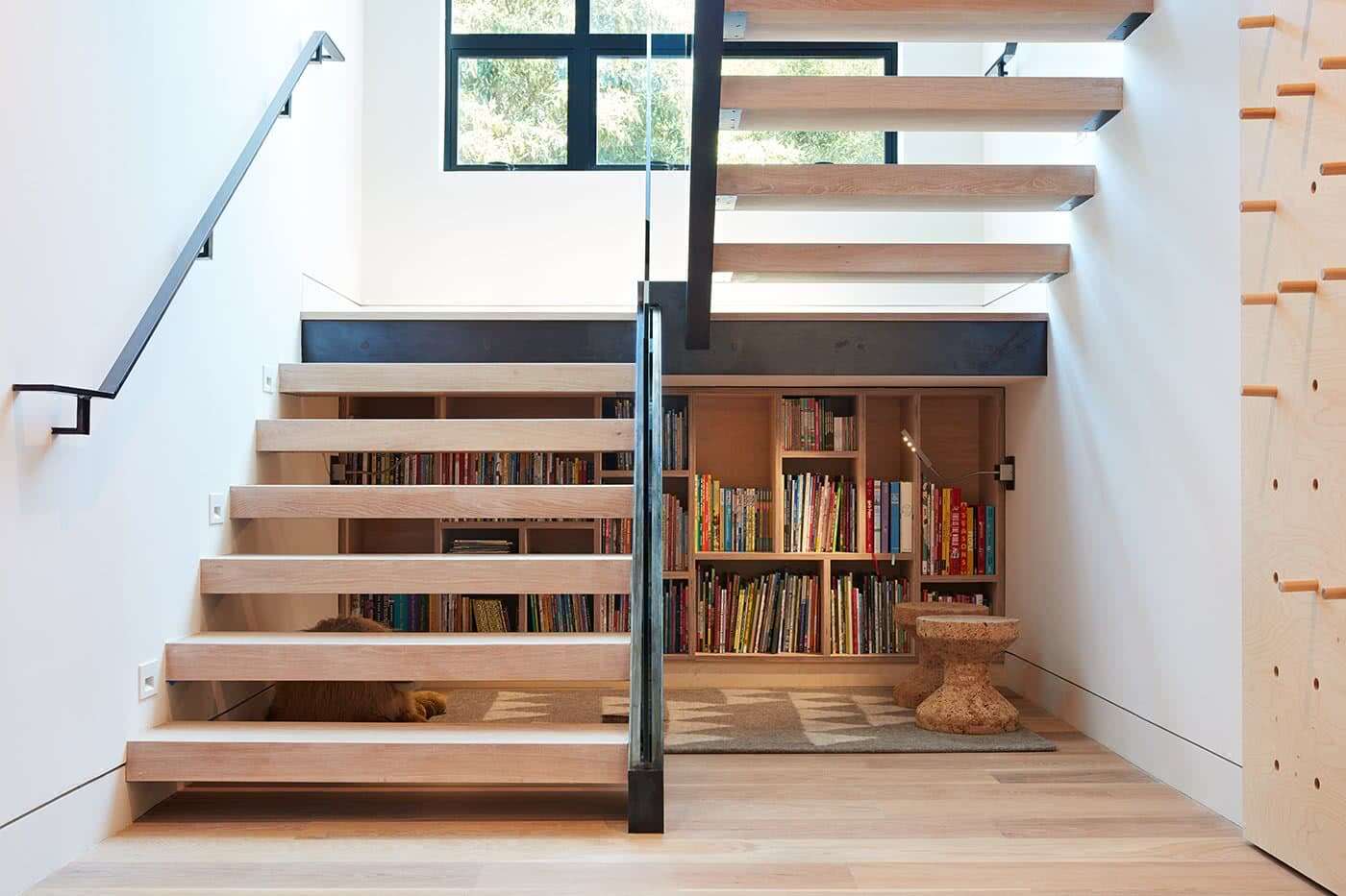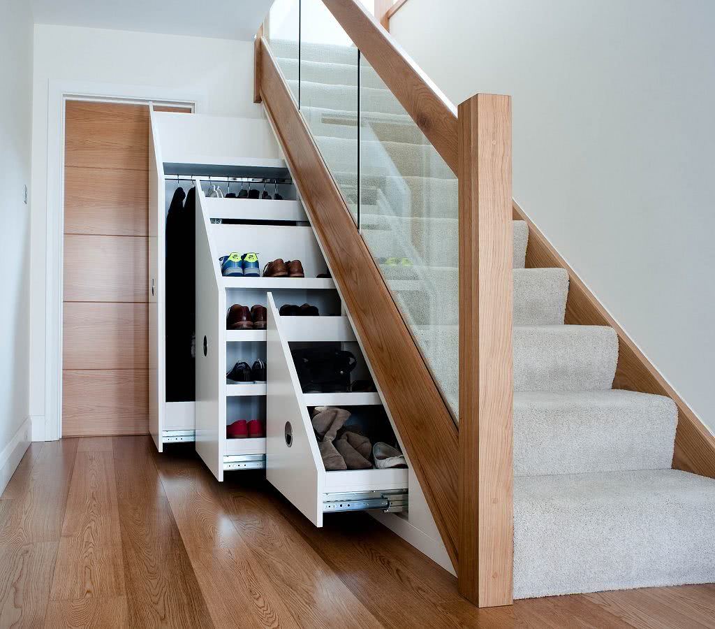 Все пространство вокруг лестницы можно эффективно застроить и обставить. Самый простой вариант — создать много открытых полок, шкафчиков и ящиков, а также удобное элегантное сиденье. Такое расположение, безусловно, найдет практическое применение в зале, где вы можете хранить шляпы, шарфы и другие аксессуары в небольших шкафах, а красивое сиденье обеспечит удобное место для надевания и снятия обуви.