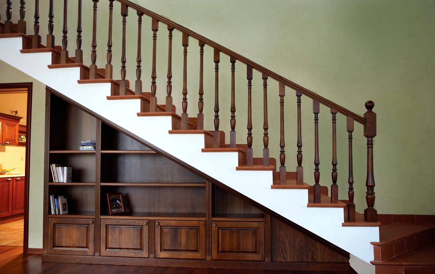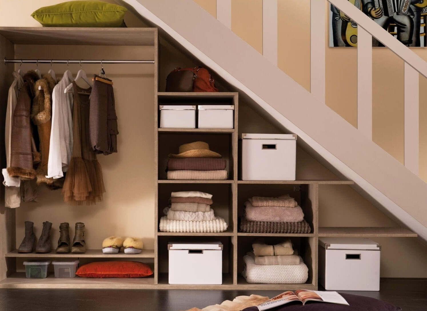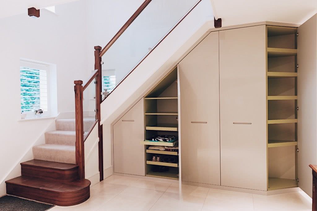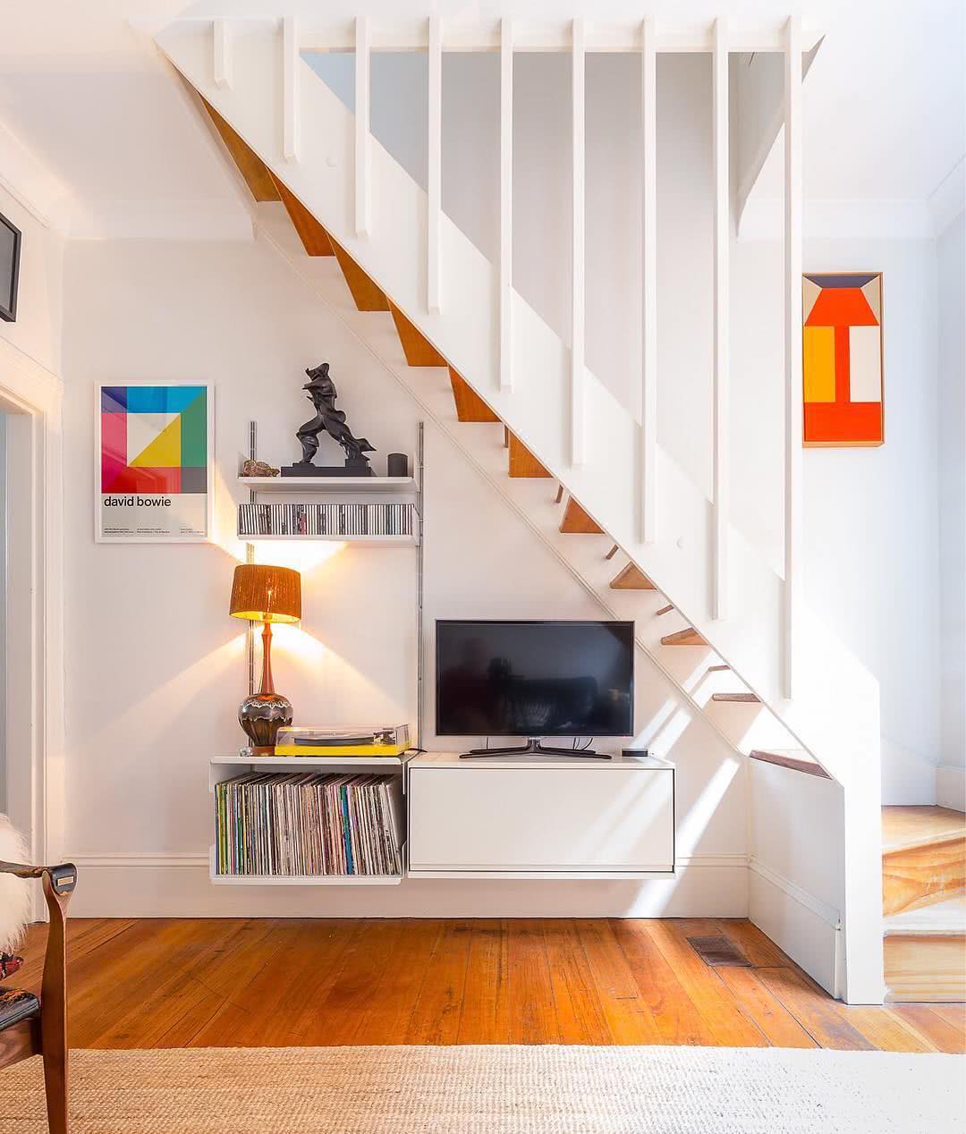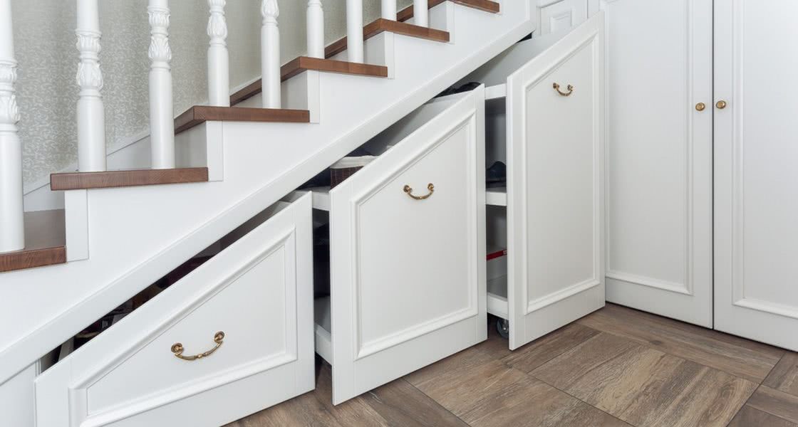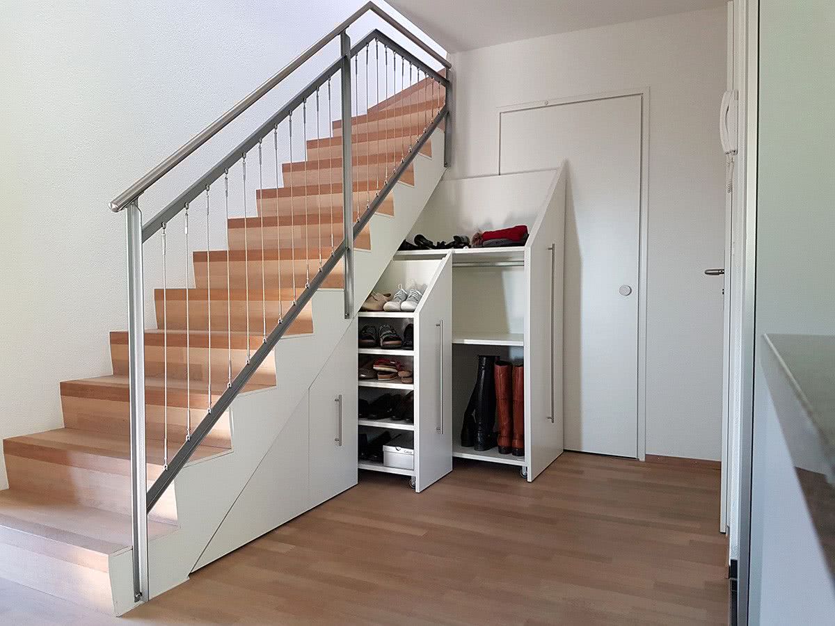 Все пространство вокруг лестницы можно эффективно застроить и обставить. Самый простой вариант — создать много открытых полок, шкафчиков и ящиков, а также удобное элегантное сиденье. Такое расположение, безусловно, найдет практическое применение в зале, где вы можете хранить шляпы, шарфы и другие аксессуары в небольших шкафах, а красивое сиденье обеспечит удобное место для надевания и снятия обуви.