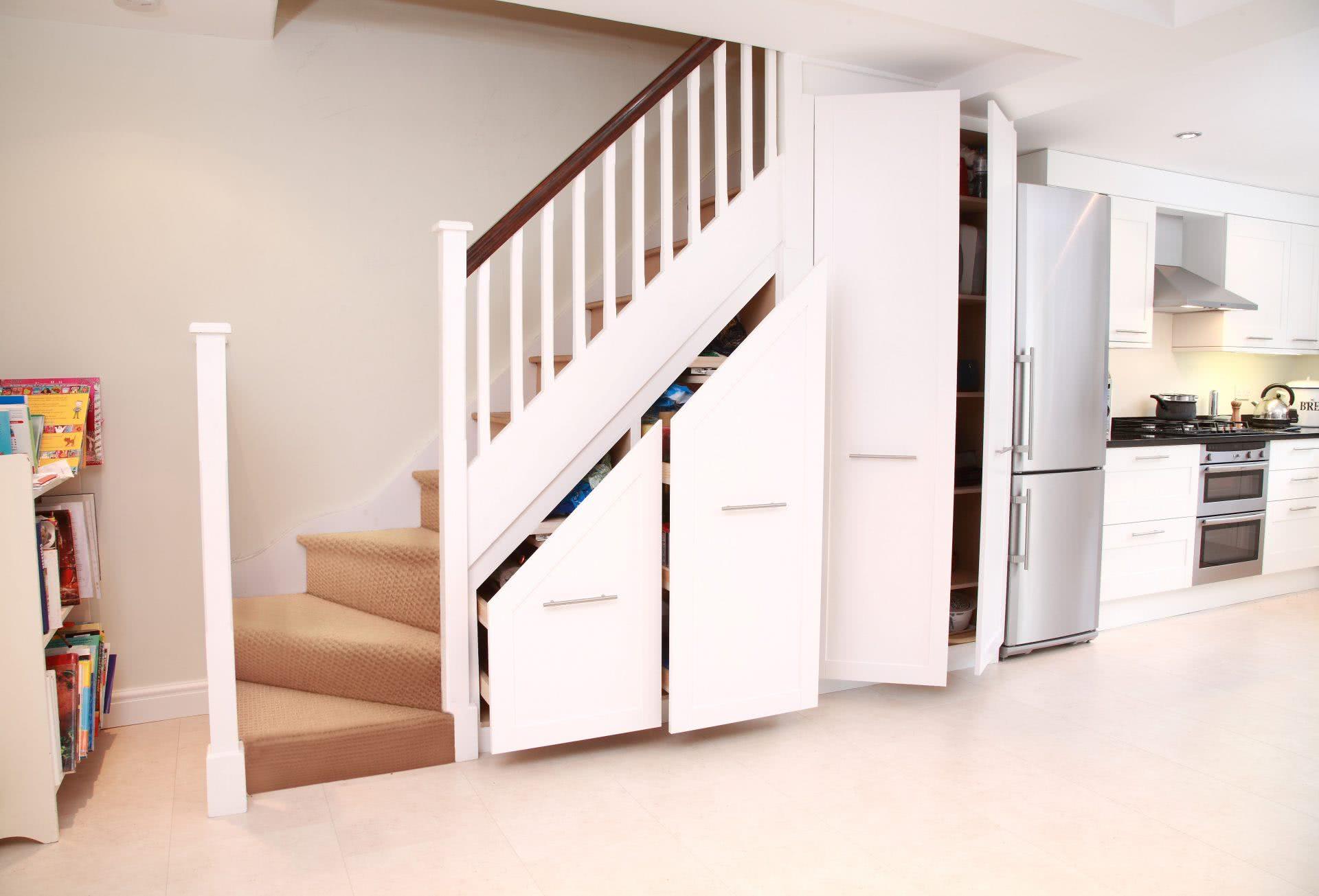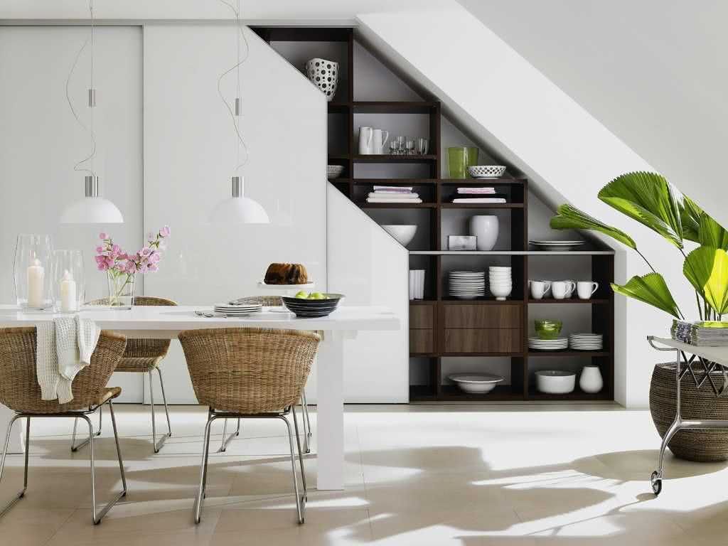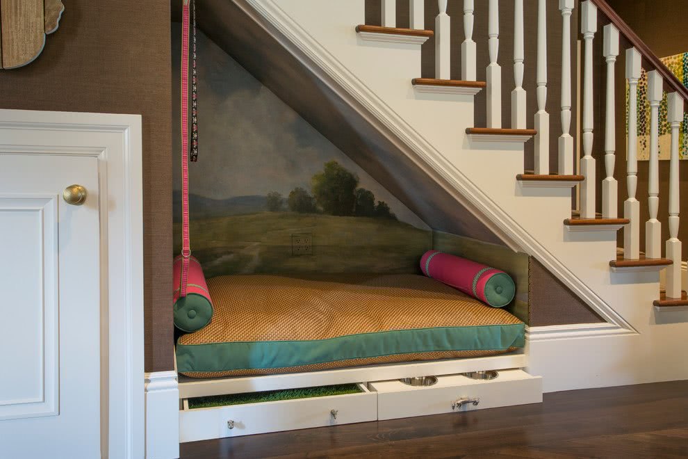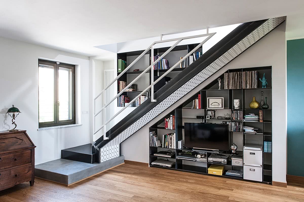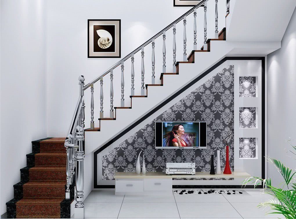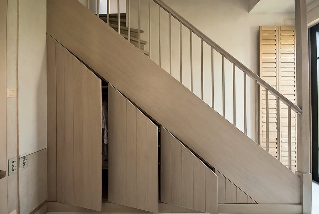 Все пространство вокруг лестницы можно эффективно застроить и обставить. Самый простой вариант — создать много открытых полок, шкафчиков и ящиков, а также удобное элегантное сиденье. Такое расположение, безусловно, найдет практическое применение в зале, где вы можете хранить шляпы, шарфы и другие аксессуары в небольших шкафах, а красивое сиденье обеспечит удобное место для надевания и снятия обуви.