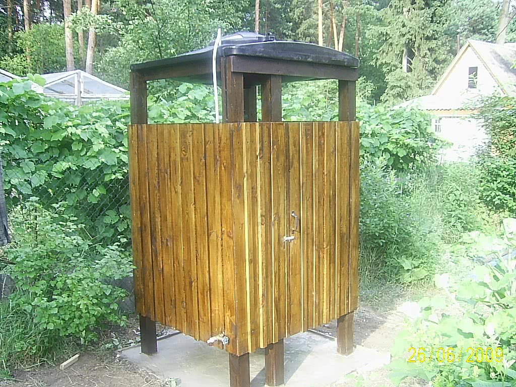 Если вам достаточно будет теплой воды, можно не использовать для этого электронагревательные приборы. В жаркое время достаточно установить емкость требуемого объема из доступного материала над кабинкой, покрасить её черной краской, чтобы был лучший нагрев солнечными лучами.