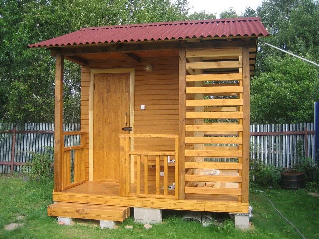 Дерево. Гораздо более экономный вариант. Если вы не борец за красоту сооружения, можно использовать даже те доски, которые валяются у вас просто так, без дела. В таком случае на обшивку тратится практически не придётся. Из минусов данного варианта — подверженность дерева грибку и плесени. Так как на доски будет постоянно литься вода, риск появления пятен плесени становится очень высок. Чтобы избежать этого — прежде чем обшивать кабинку обработайте доски специальными пропитками и лаками.
