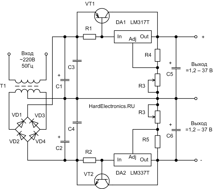 Если нужно построить двуполярный регулируемый стабилизатор напряжения, то нам поможет аналог LM317T, но работающий в отрицательном плече стабилизатора — LM337T.