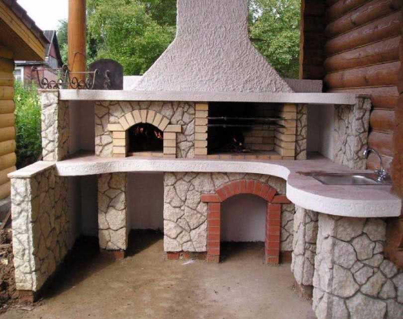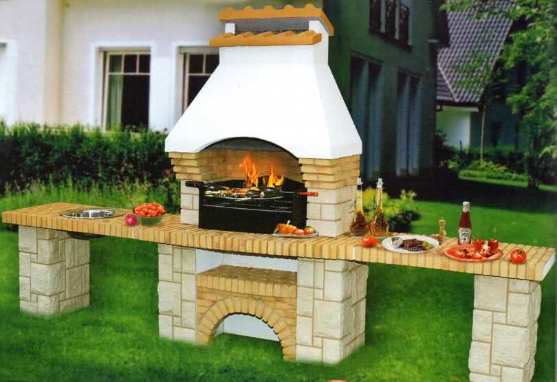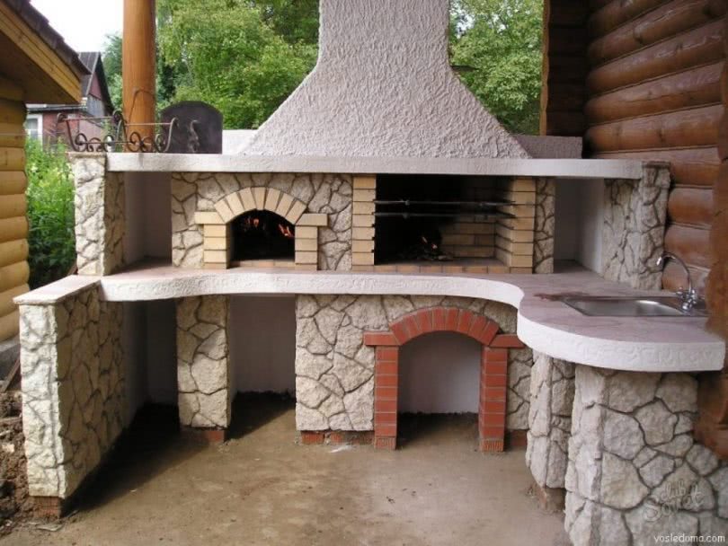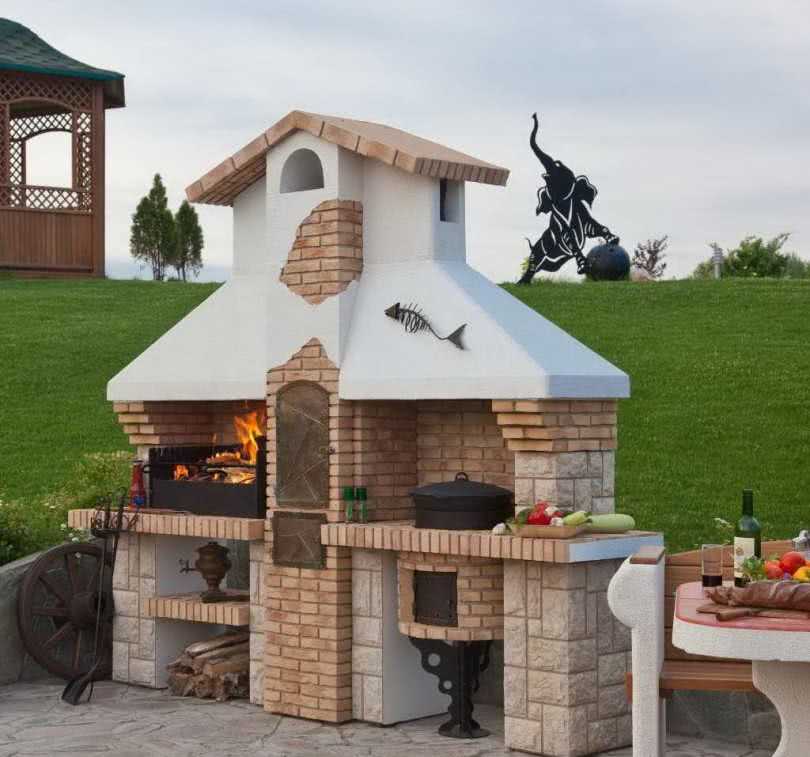 В таком случае, хозяин может придать данной конструкции целый ряд функций, не ограничиваясь исключительно приготовлением продуктов на жаре от перегоревших дров или древесного угля. Рядом с барбекю можно установить печь с варочной поверхностью, зарезервировать места для хранения дров, установить поверхность для разделки продуктов. Поэтому в данном случае имеется смысл говорить о целом комплексе, предназначенном для приготовления на улице различных блюд.