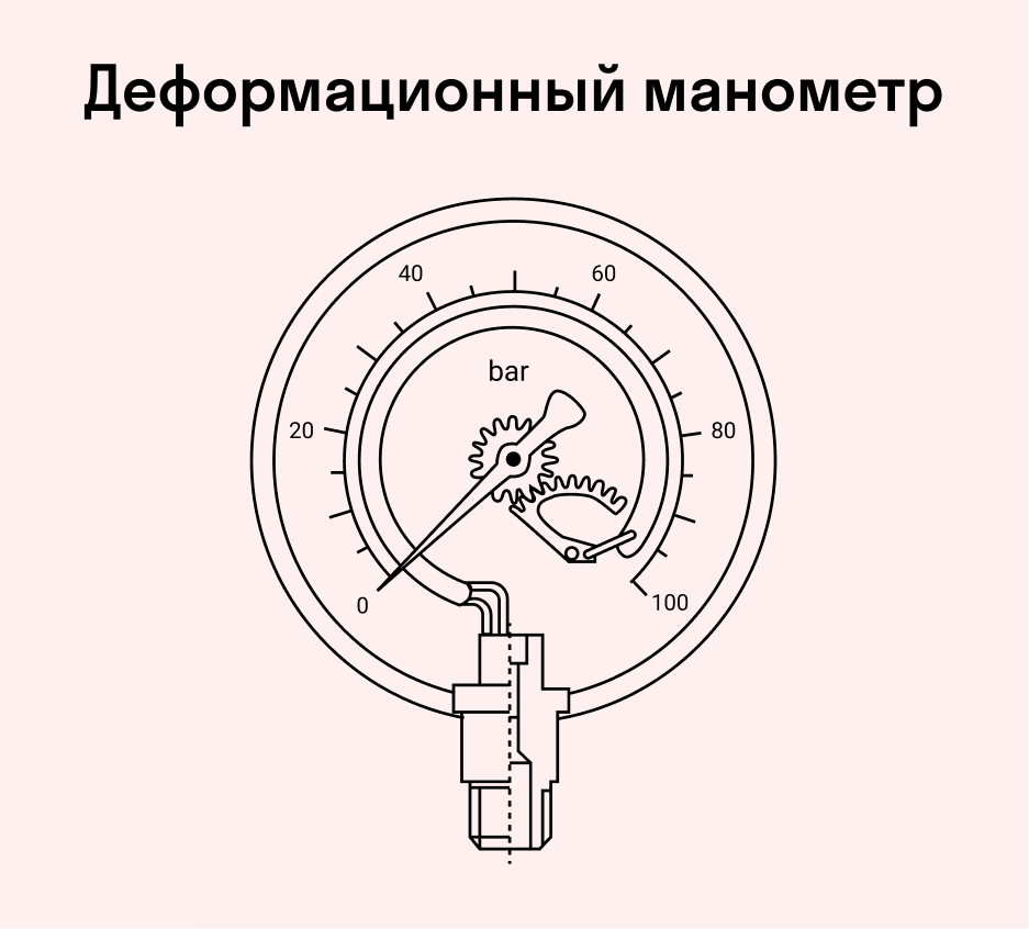 Вместо трубки может быть использована пружина, мембрана или другой чувствительный элемент, который деформируется под давлением. Принцип действия манометра остается тем же: деформация передается на стрелку, движущуюся по шкале.