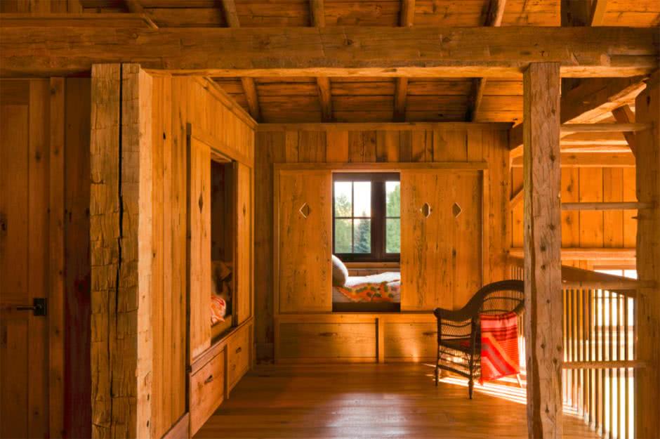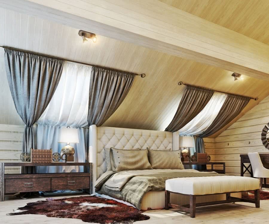 Она может быть чердачным помещением деревянного загородного дома с наклонными стенами, которые позволяют встать в полный рост только в самом центре. Такой мансардный этаж часто имеет сильный скос, плохо тесаные бревна вместо стропил, сложную переломанную форму потолка без окон.