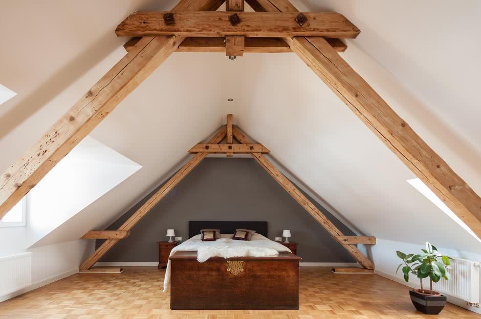 Если выкрасить стропила в контрастные тона – они станут стильной деталью интерьера