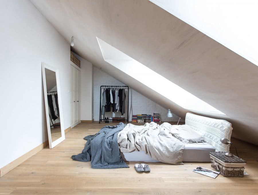 Низкие мансарды и те, которые имеют небольшое пространство, требуют особой заботы о пространстве и хорошем освещении. Это свет, который заставляет вас чувствовать себя свободными в интерьере, оптически увеличивая комнату. Вот почему на чердаке с большим количеством наклонных стен лучше выбрать очень легкие оттенки, предпочтительно те, которые создают слегка блестящее, атласное покрытие, усиливающее эффект пространства.