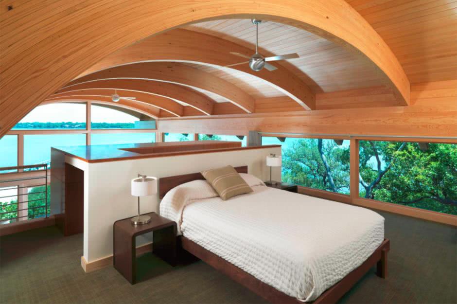 Под двухскатной кровлей, где внешне недостаточно места, размещают спальни. Часто кровати устанавливаются в ниши под скошенные стены. Можно сделать мастерскую, гардеробную или кабинет на мансарде.