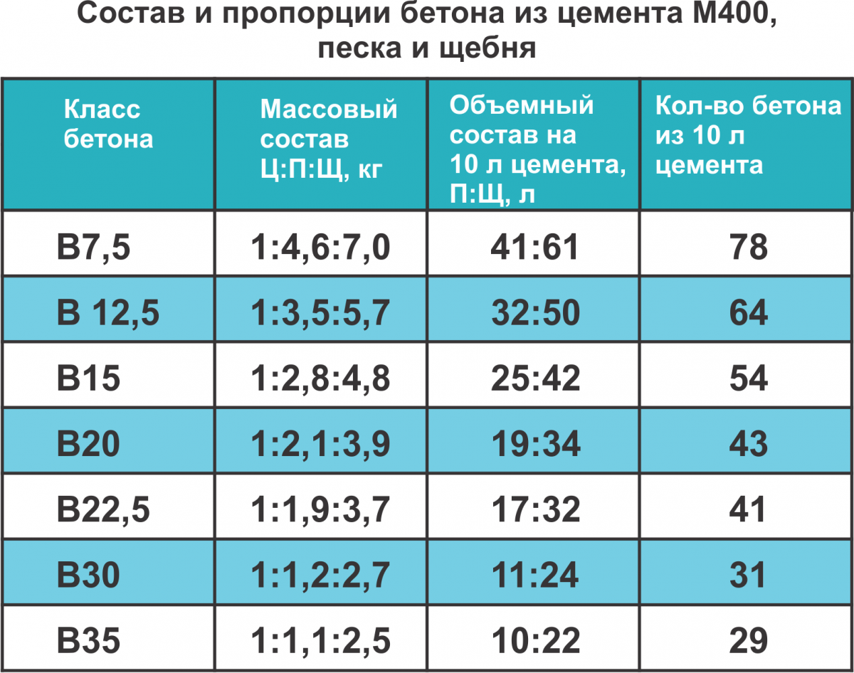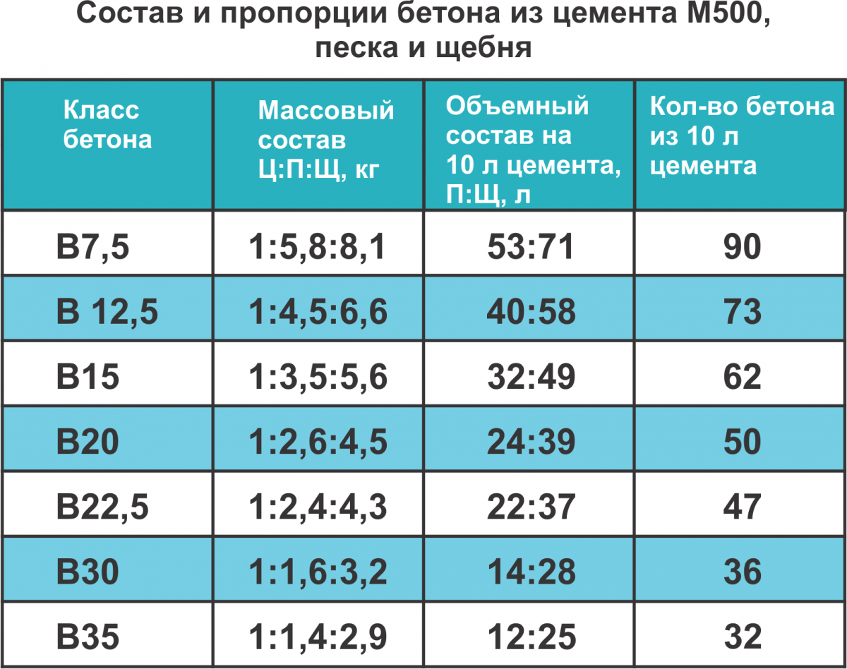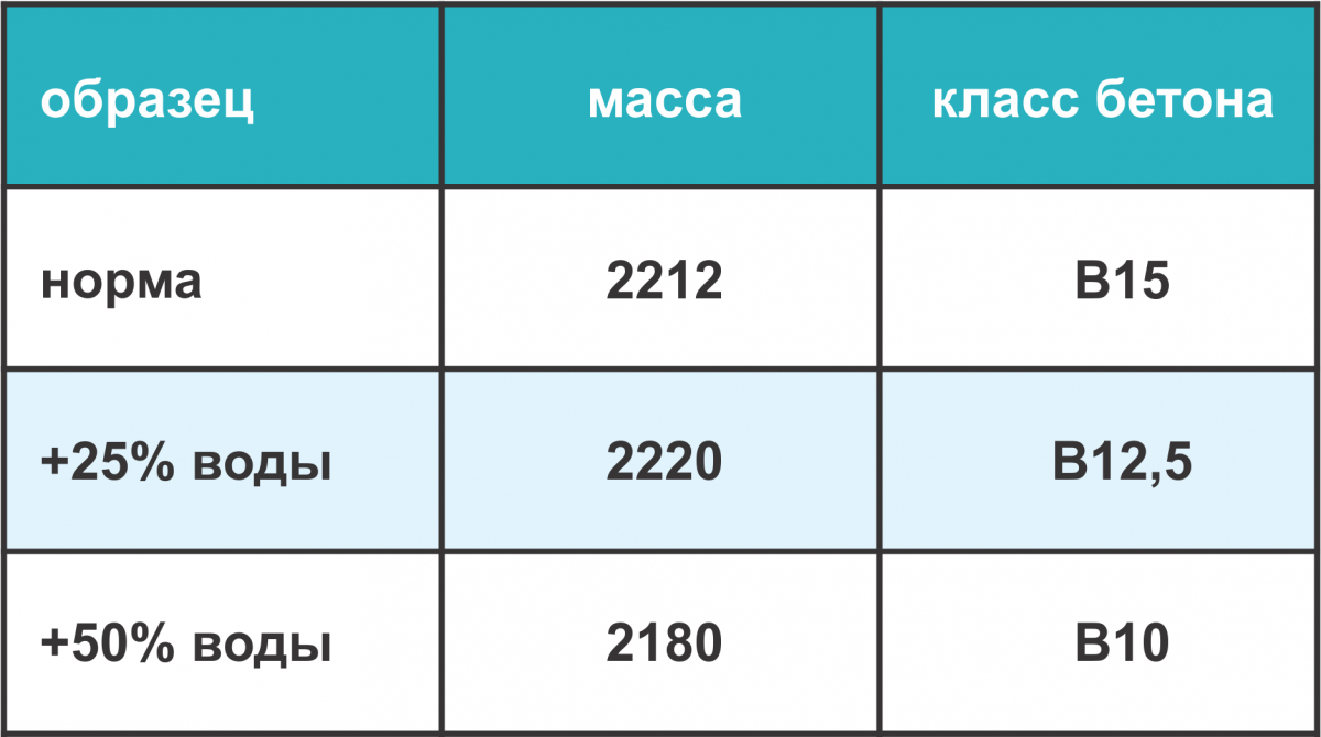 На предприятиях или при приготовлении смеси в бетономешалке, даже при полном соответствии с таблицей соотношений компонентов, получаемый материал имеет различную прочность. Многое зависит от условий приготовления, качества составляющих компонентов.