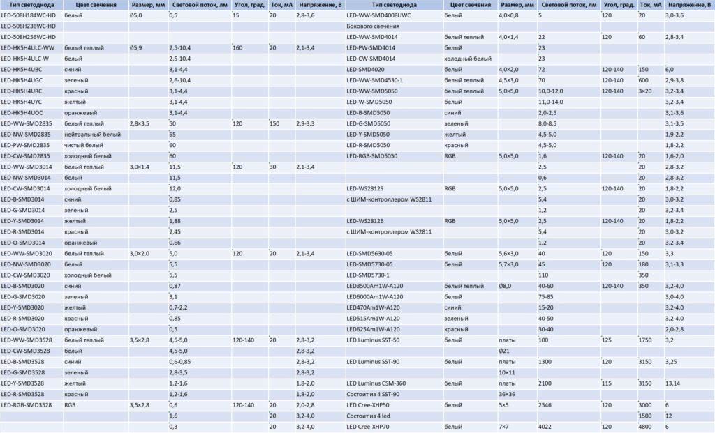 Таблица характеристик и типоразмеровпопулярных SMD светодиодов.