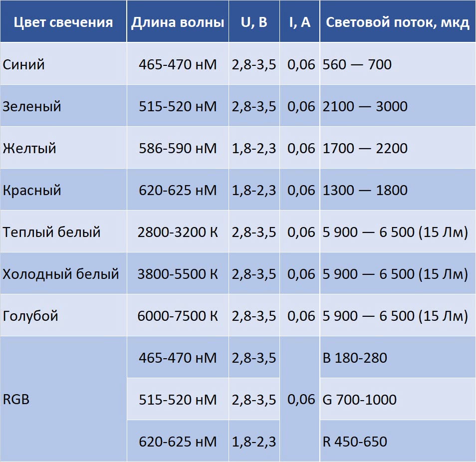 | Синий | 450-500 нм | от 2.5 до 3.7 В |