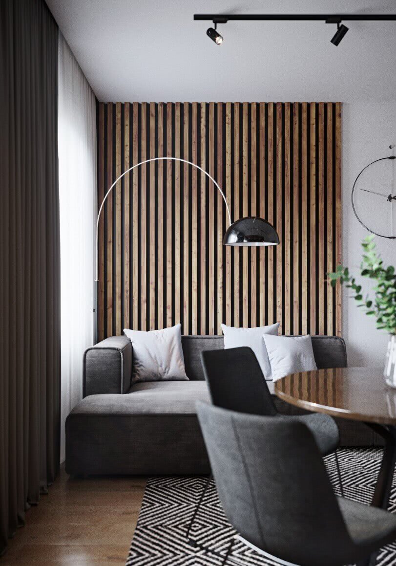 Особую оригинальность интерьеру гостиной придаст покрытие стены деревянными плитами разной формы и размера, расположенными в трёх плоскостях, параллельных стене, и частично перекрывающих друг друга.