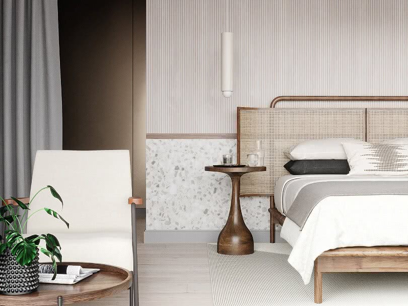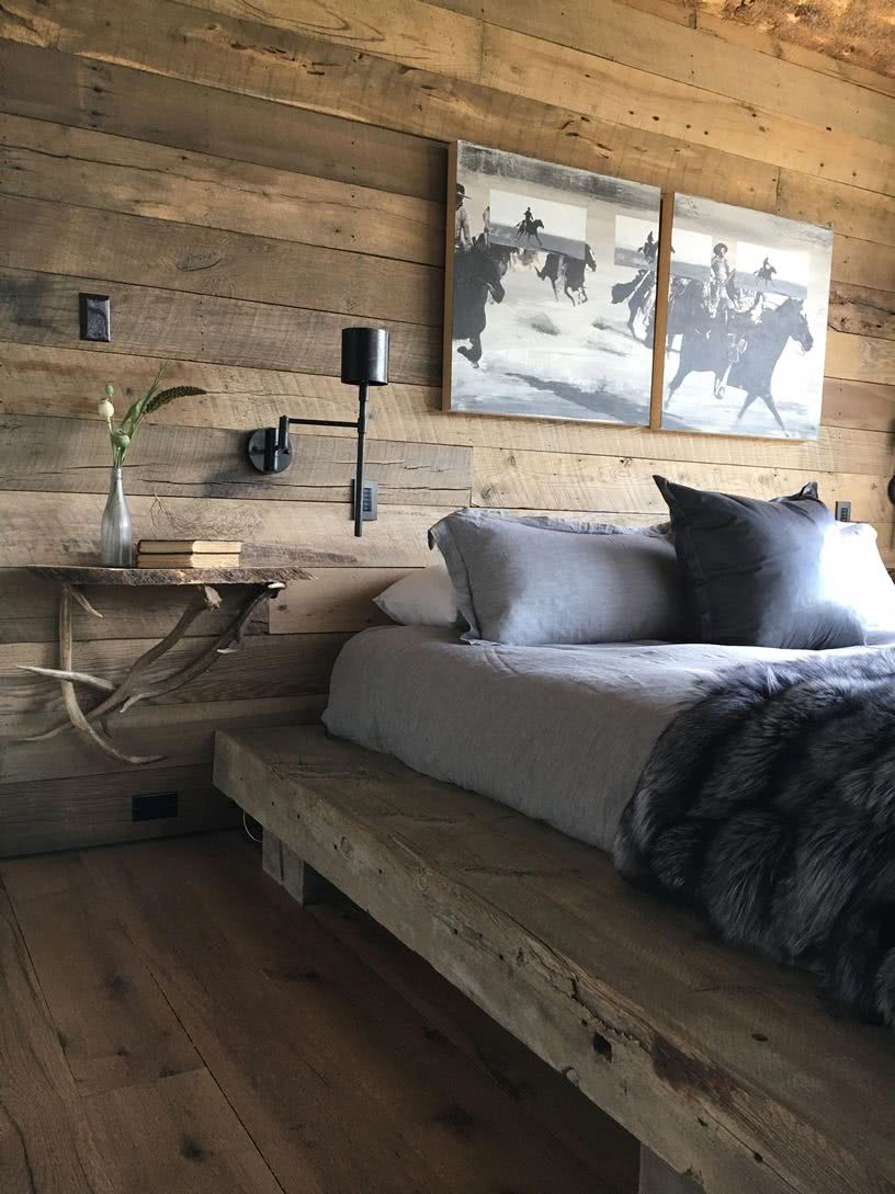 Закрытая панелями из древесины или вагонкой стена позади изголовья кровати обеспечит отличную звуко- и теплоизоляцию.