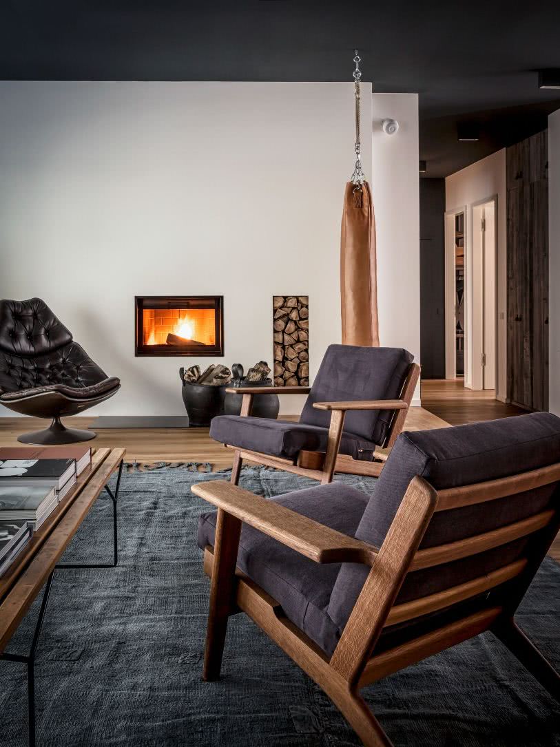 Чтобы гостиная выглядела уютно и в то же время респектабельно, к деревянной мебели можно добавить выполненные из древесины окна, двери, паркет, массивную или палубную доску и облицовку камина.