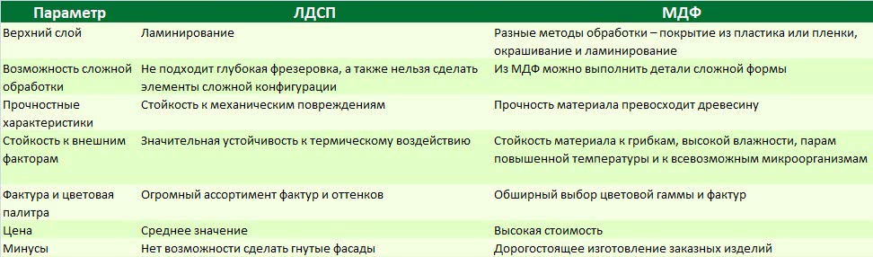 Сравнительная таблица ЛДСП и МДФ.