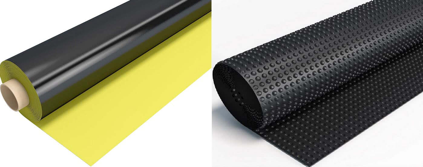 Плоская пленочная (слева) и профилированная (справа) мембраны для гидроизоляции фундамента