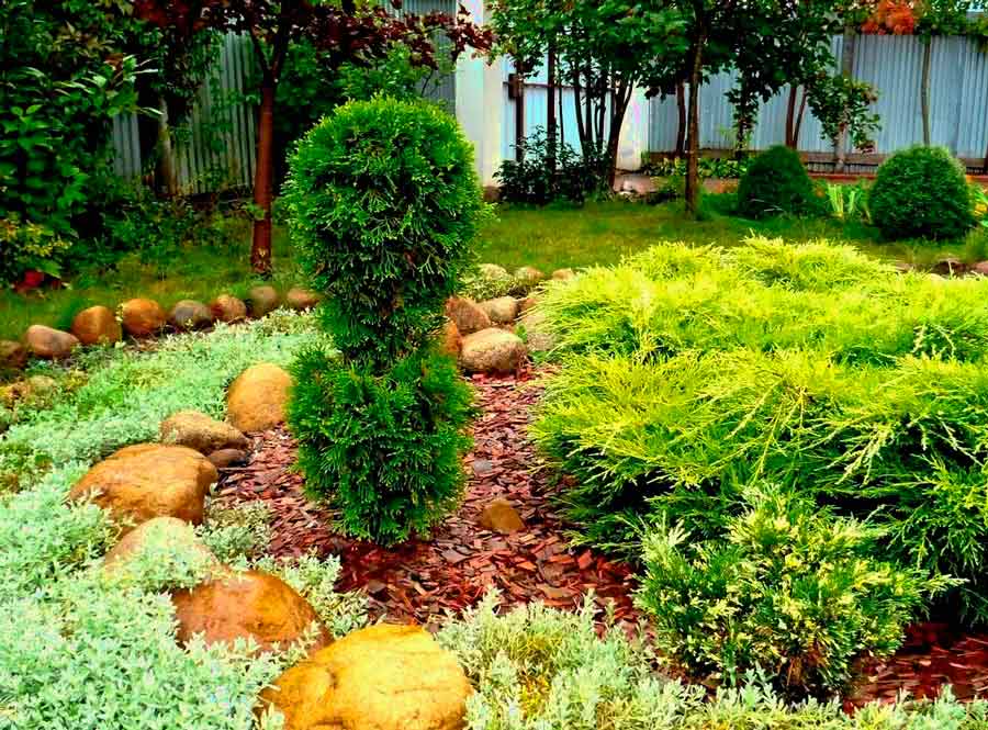 Подбор растений в целом зависит от местонахождения и вида хвойного миксбордера. Если вы создаете миксбордер геометрической формы по центру садового участка, то в нем прекрасно впишутся туи. Туи хорошо подходят для живой изгороди. Если вы желаете сделать изгородь гуще, можно посадить русские ели в 3 ряда. В миксбордере, который будет находиться в конце сада, хорошо смотрятся стелющие можжевельники.