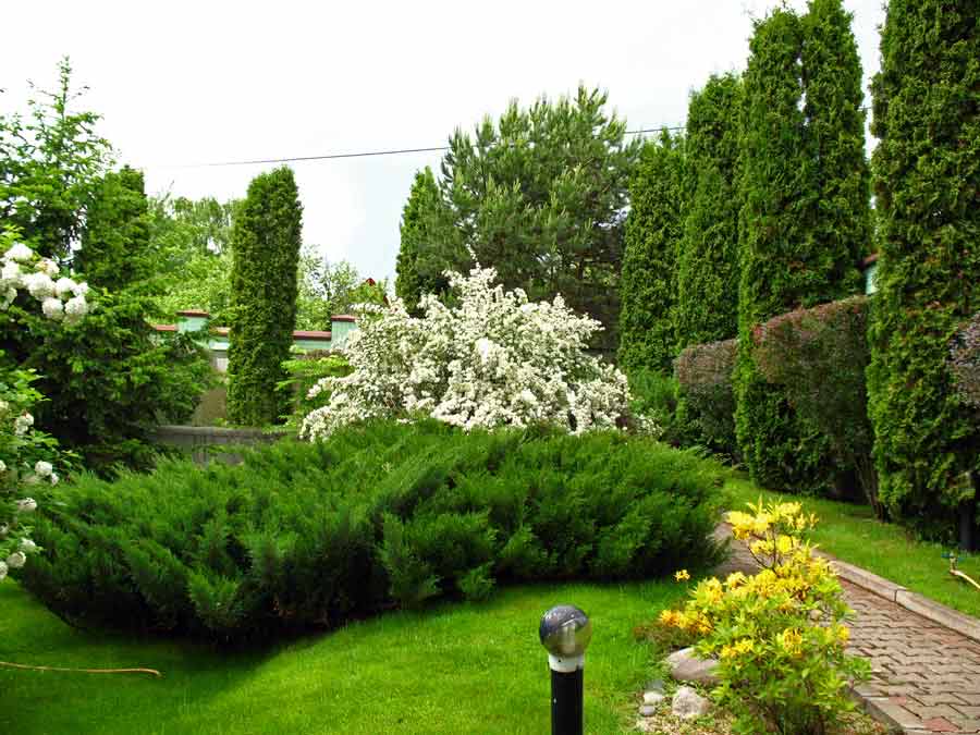 - При подборе растений, высаживаемых рядом с вечнозелёными видами, старайтесь подбирать такие экземпляры, у которых сходная с хвойниками агротехника выращивания. Это обеспечит комфортное существование растениям и облегчит вам уход за ними.