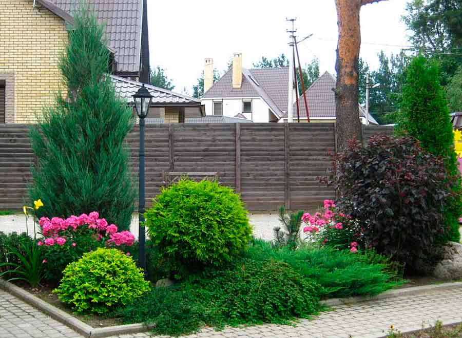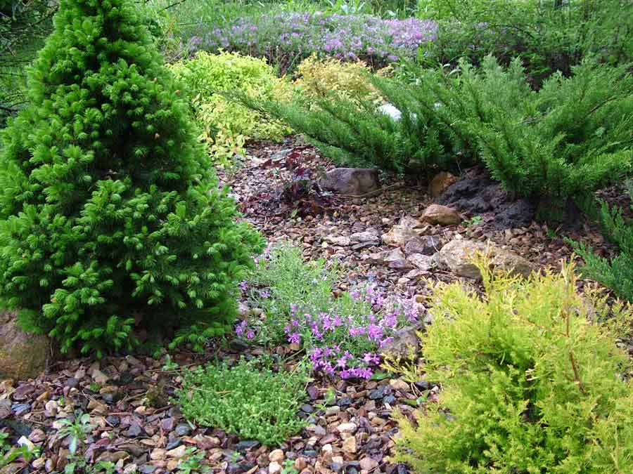 - Если вы планируете высадку цветов, то учитывайте сроки их цветения и сочетаемость цветовой гаммы соцветий с оттенками хвои. Не допускайте излишней пестроты и обилия различных фактур и размеров растений.