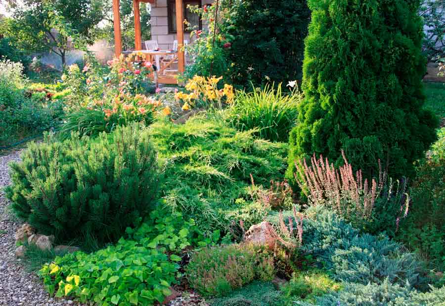 С хвойными деревьями. Миксбордер с вечнозелёными хвойными украшает ландшафтный дизайн на протяжении всего года