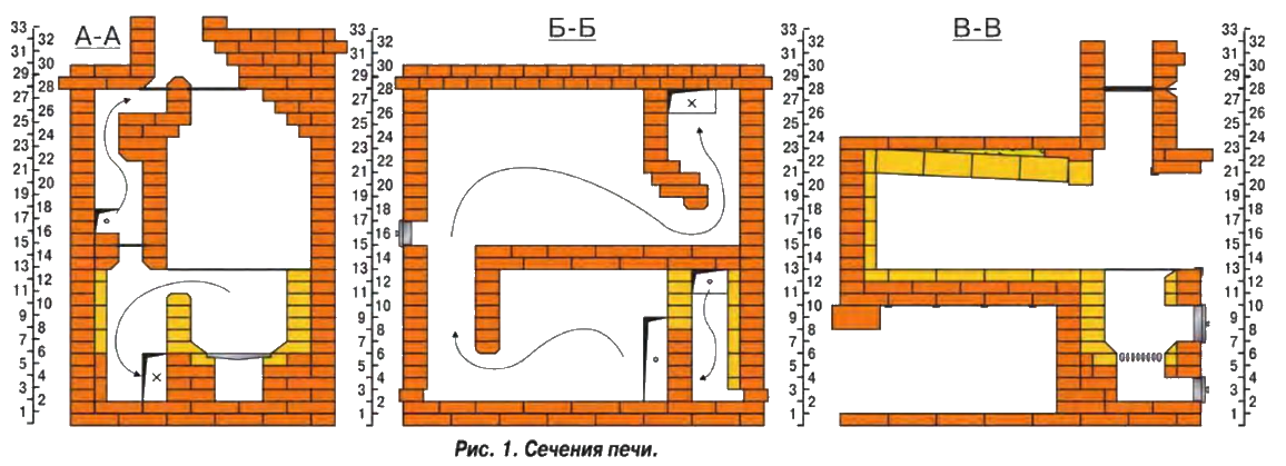С 22 по 32 яруса строится передняя часть отопителя. На 24-м ряду ставятся обе дымовые задвижки, на 25-м – железная полочка размером 42 х 32 см. Уложив 29-й ярус, перекройте печурку таким же листом.