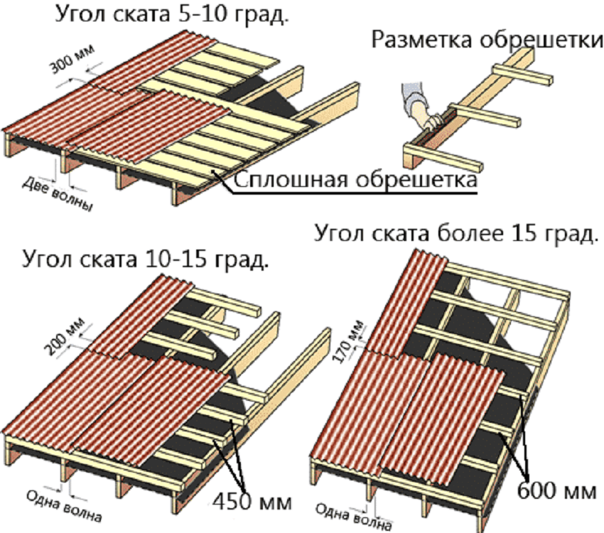 - Если угол наклона меньше 14°, то листы укладывать нужно по горизонтали с нахлестом 20 см.