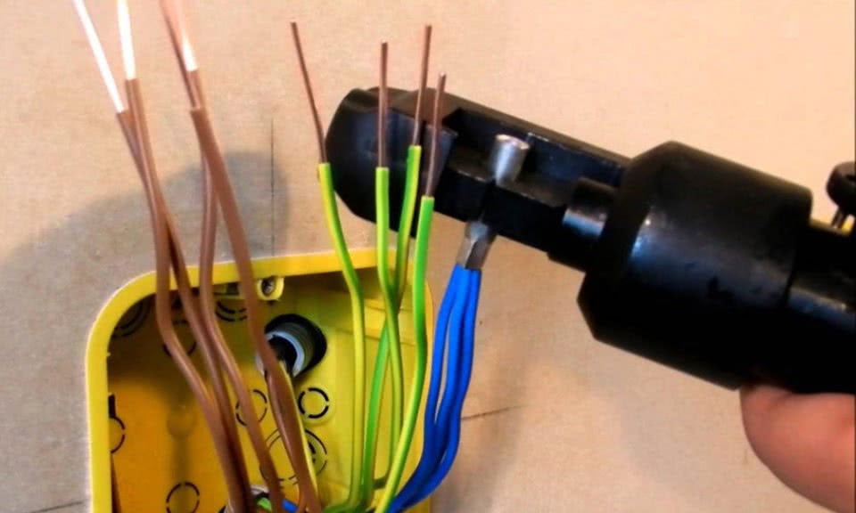 Для помещения, где предполагается использовать большие или средние токи, лучшим способом соединения проводов будет опрессовка их гильзами. Такое подключение проводов в распределительной коробке обеспечит механическую прочность и надежный электрический контакт. Процесс опрессовки происходит так: