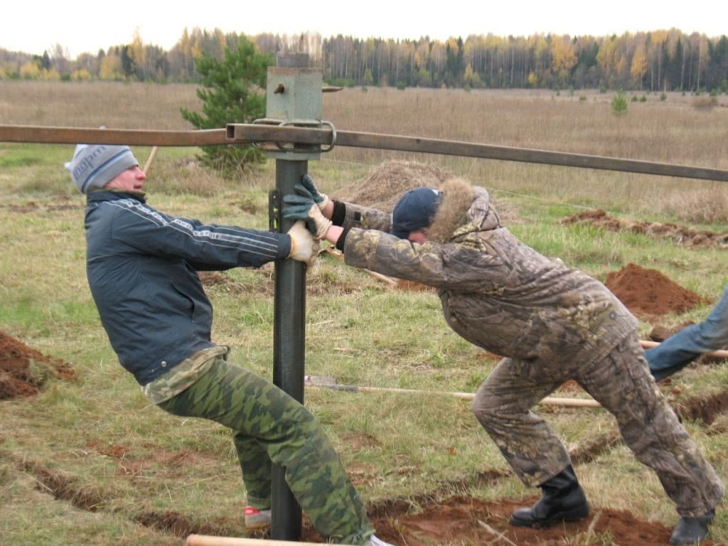 Самостоятельно можно ввинчивать сваи, не длиннее пяти метров в лёгкие грунты. Лучше этот процесс проделывать втроём. Два человека работают на рычагах, а один постоянно проверяет уровень по вертикали. Для каждой установки буром подготавливают углубления до одного метра. Можно и меньше. В подготовленное углубление ставят установку и проверяют вертикаль. По технологии, в верхней части каждой винтовой сваи предусмотрены отверстия. В эти отверстия вставляется лом с квадратной трубой.