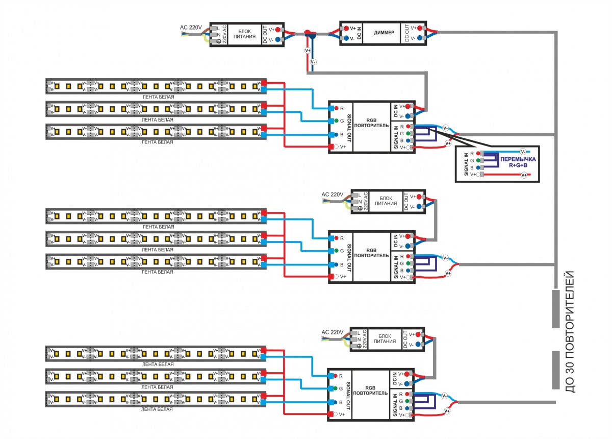Принцип подключения многоцветных (RGB) светодиодных лент тот же, но за одним исключением. В цепи присутствует контроллер, который отвечает за автоматическую смену режима цвета.