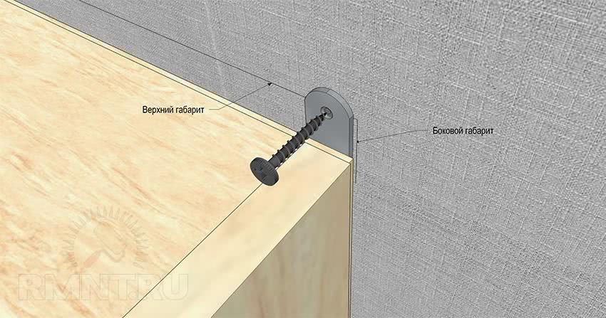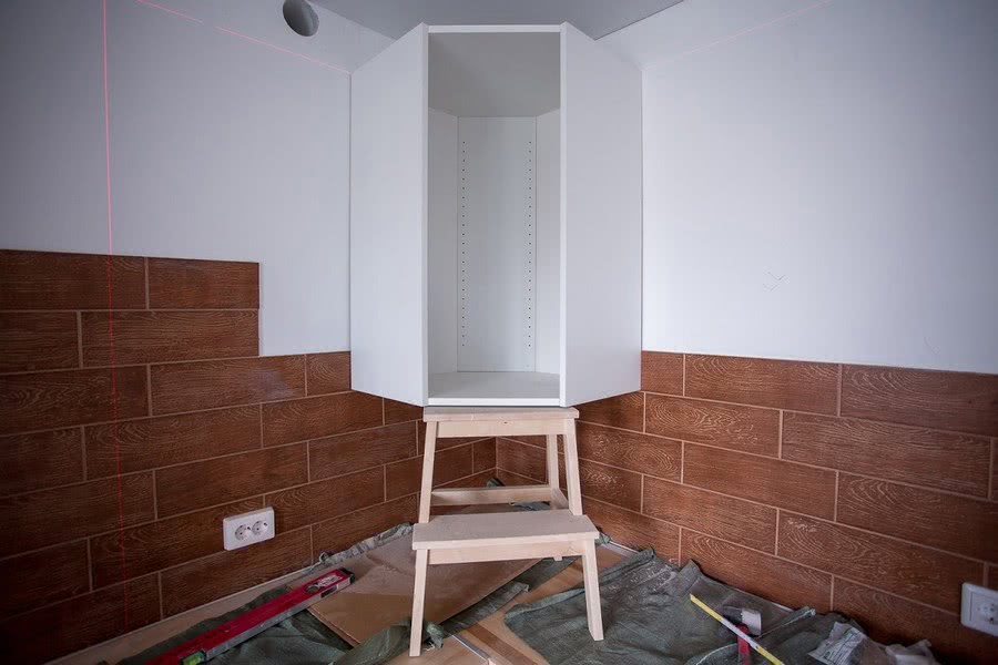 Особенность монтажа углового шкафа заключается в том, что крепежи фиксируют на двух стенах