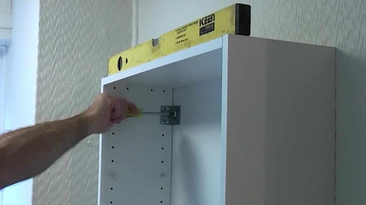 - на последнем этапе шкаф подвешивают и проверяют совпадение его верхнего края и нанесённой горизонтальной линии;