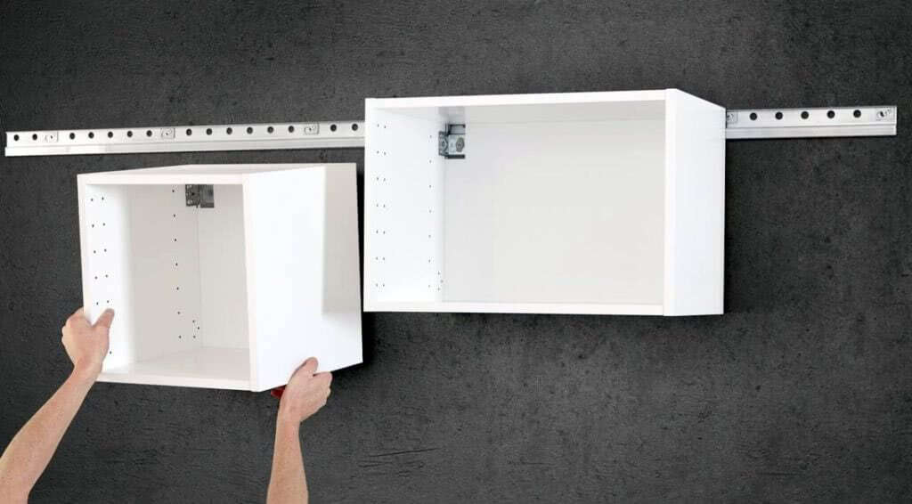 Корпус навесной мебели нужно установить на шину. Ориентир – плоскость стены.