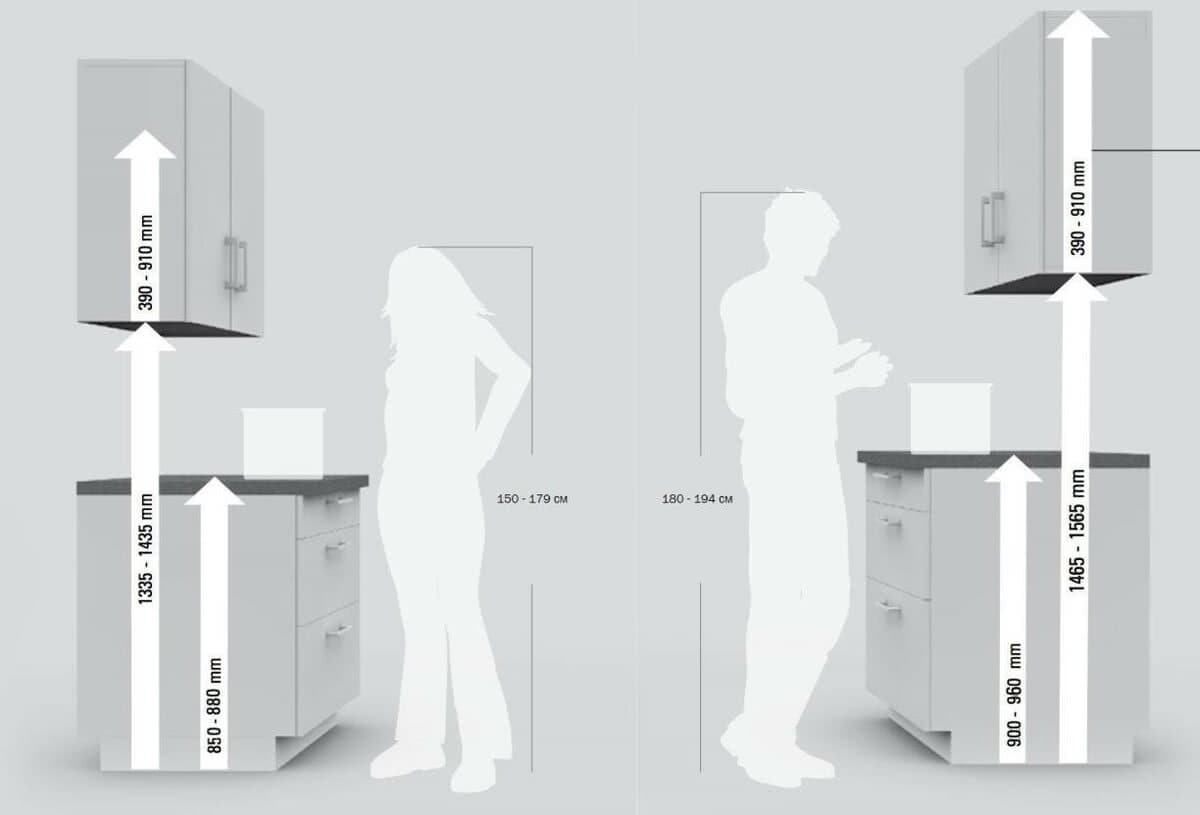 - Если не планируется монтировать столешницу или нижнюю часть гарнитура, то соотношение роста человека и высоты крепежа должно выглядеть следующим образом: