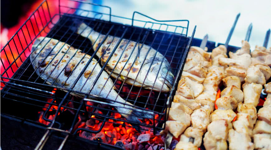 4. Начинайте жарить только после того, как уголь покрылся белым пеплом. Под выложенными на решетку продуктами или под шампурами должен быть уже готовый уголь. Не забудьте смахнуть пепел!