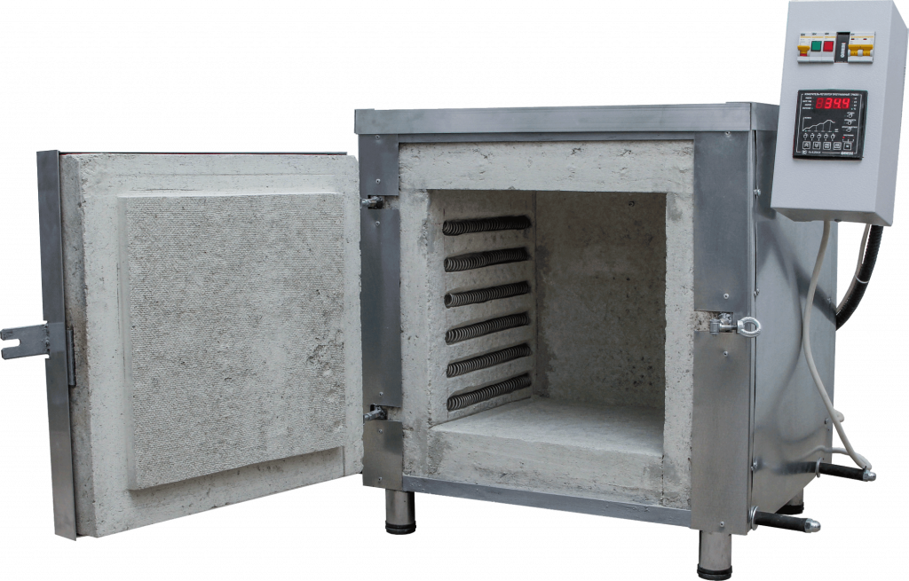 Муфельная электропечь для обжига керамики состоит из камеры нагрева и теплоизоляционного корпуса, сохраняющего жар и защищающего от него окружающую среду и работников. Внутри печи температура может достигать 1000°С и выше.