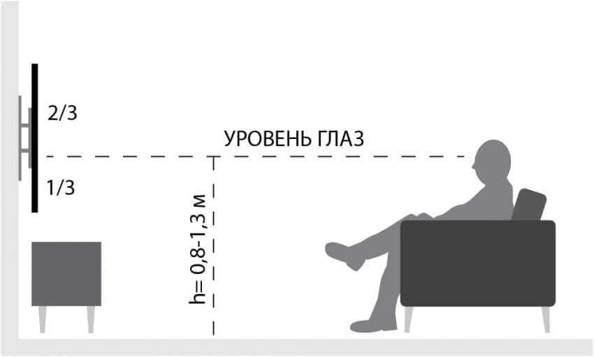 - если просмотр идет из разных точек помещения, из разных поз – сидя, стоя, лежа – выбираем среднее арифметическое, то есть все-таки на уровне сидящего человека;