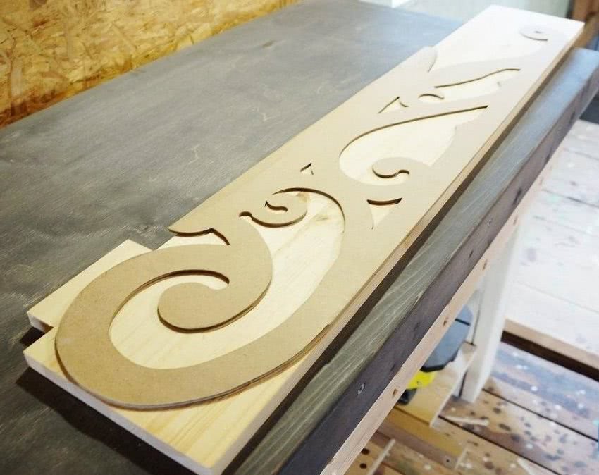 - С помощью шаблона перенести рисунок на основу. Прорезной узор потребует доски любой ширины и толщиной в 30 мм, для накладного эта цифра уменьшается до 10.