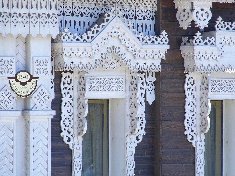 Деревянный дом красив сам по себе, но наличники придают ему непоколебимую и абсолютную уникальность, потому что их узор каждый раз иной. Геометрические и растительные орнаменты, фантастические создания замерли, охраняя покой домочадцев. Диковинные кружева расплескались вокруг окон, невесомой пеной свисают с карниза крыши и перил мансарды.