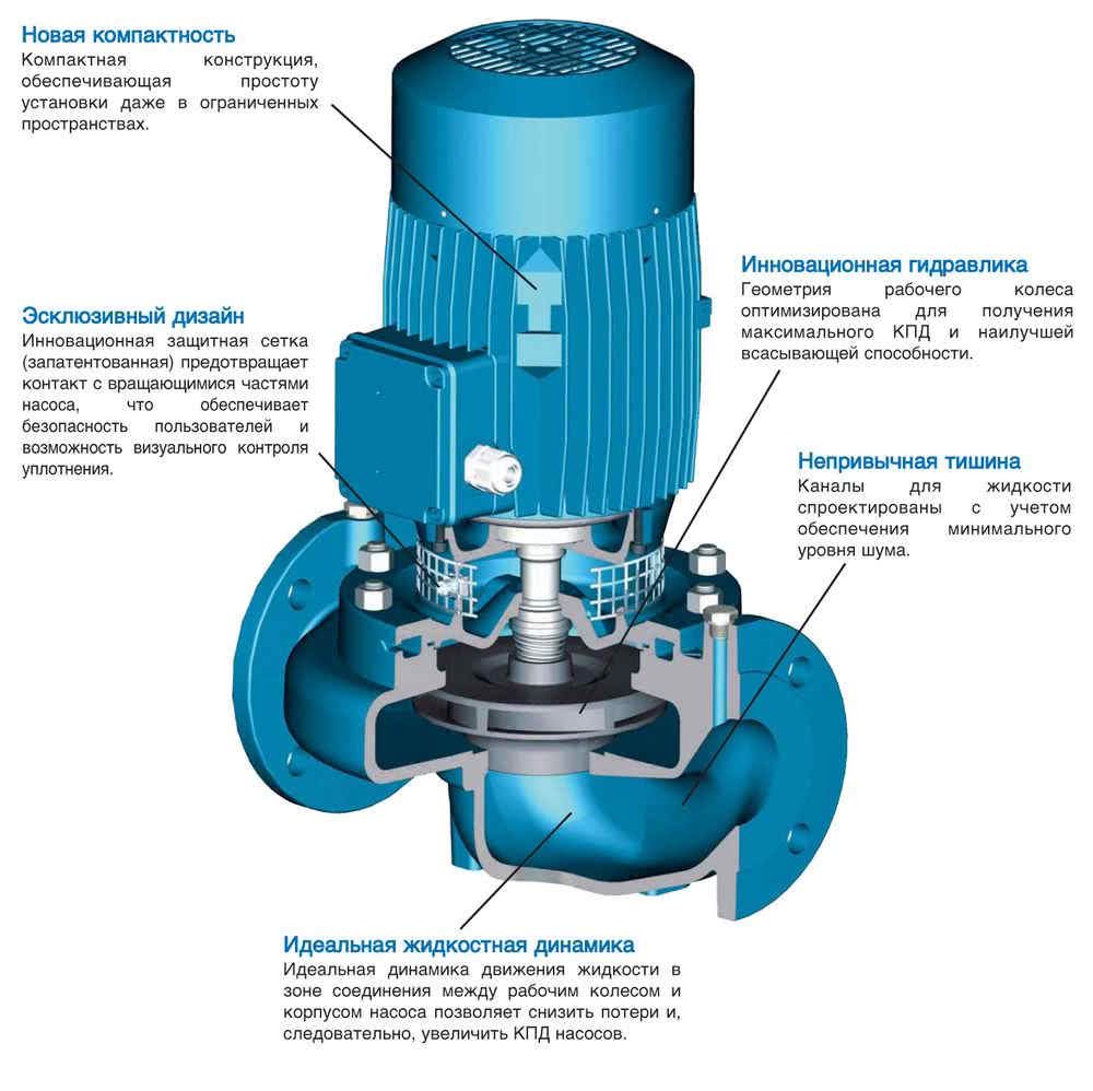 За счет размещения крыльчатки насоса в непосредственной близости к ротору (в большинстве случаев в одном корпусе) появляется возможность минимизировать внешние размеры. Для предупреждения попадания воды в электродвигатель на вал привода установлены надежный сальник из модифицированной особо прочной и износостойкой резины. В некоторых случаях предусмотрена установка двойной гидрозащиты. Насос очень компактный, устанавливается непосредственно в отапливаемых помещениях. Гарантированной мощности достаточно для обслуживания отопительной системы помещений общей площадью до 400 м2. Насосы обладают низкой шумностью, работают от однофазной сети напряжением 220 В. Имеют относительно высокую производительность и низкое потребление электрической энергии, корпус полностью герметичный с небольшим весом. Такие характеристики позволяют устанавливать насос непосредственно на трубопроводах, дополнительной фиксации на несущих поверхностях не требуется. Для исключения возникновения рисков поражения током электропроводка, обмотки и корпус имеют повышенную защиту. Для предупреждения перегрева обмоток статора и ротора вследствие длительного периода работы на критических значениях мощности установлено биметаллическое тепловое реле.