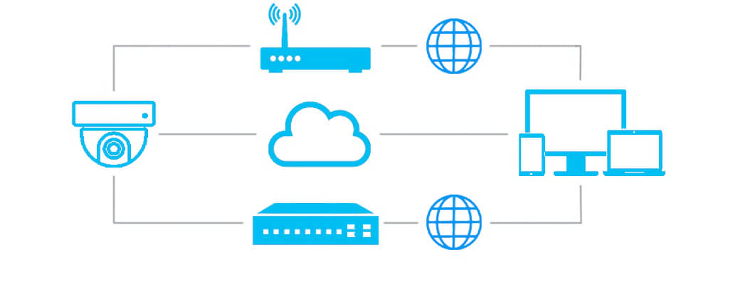 Цифровая видеокамера подключается к локальной сети проводным или беспроводным способом к роутеру/свитчу. В интерфейсе маршрутизатора, ей присваивается уникальный IP-адрес, по которому производится настройка параметров аудио и видео, хранения записей и других функций, предусмотренных самой камерой. Избежать настройки роутера и присвоению камеры IP-адреса, можно с использованием облачных технологий. Подключение системы видеонаблюдения к облаку происходит с помощью версии прошивки оборудования, интегрируемой с компьютером или, и вовсе, через сайт облачного хранилища.