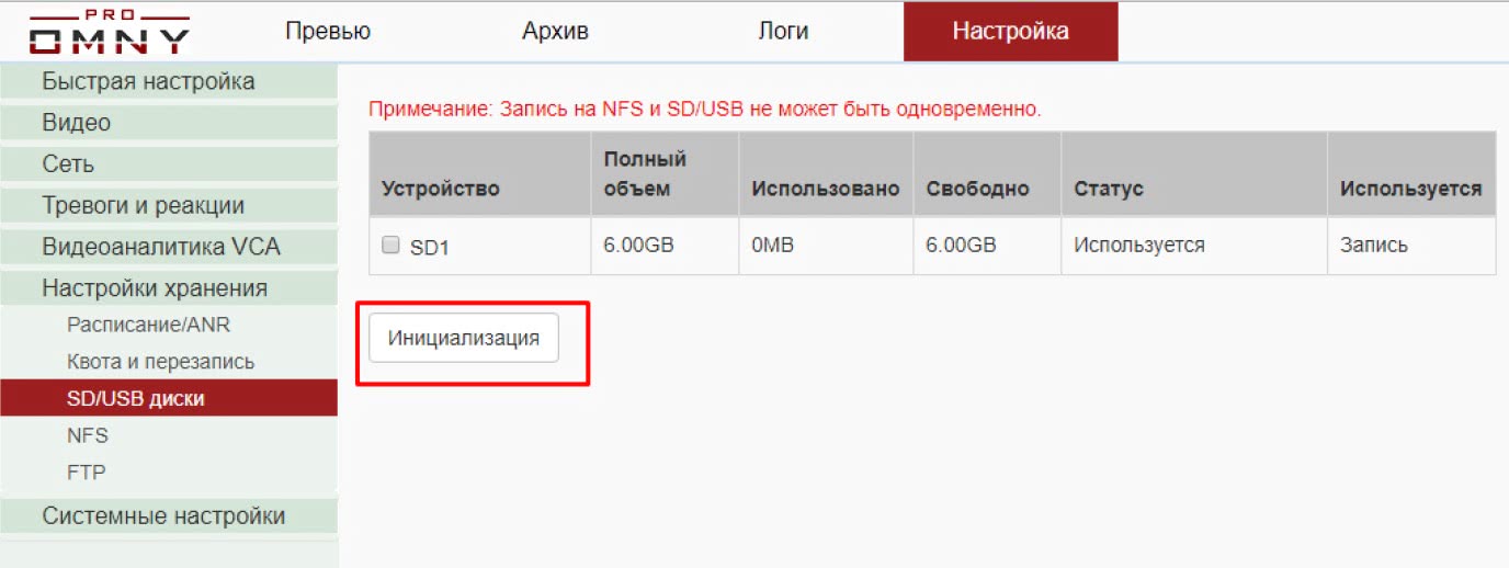 После этого нужно зайти в WEB интерфейс в раздел Настройка/Настройки хранения/SD/USB диски. Обязательно убедитесь, что камера видит карту памяти. Лучше это сделать до монтажа камеры на ее месте, где она будет работать. После этого нажмите кнопку инициализация Когда она завершится — перезагрузите камеру, чтобы она увидела новый формат.