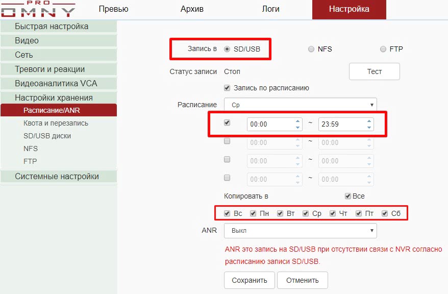 Для постоянной записи по указанному времени переходим в «настройки хранения/Расписание ANR