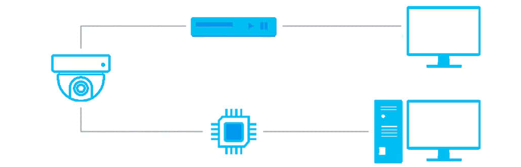 Устройство видеонаблюдения зависит от используемого оборудования, но общий принцип один: камера считывает информацию и передаёт на обработку регистрирующему устройству, после чего изображение выводится на экран (с записью на какой-либо накопитель или без). Если описать такую структуру подробнее, то системы разделятся на аналоговую и цифровую.